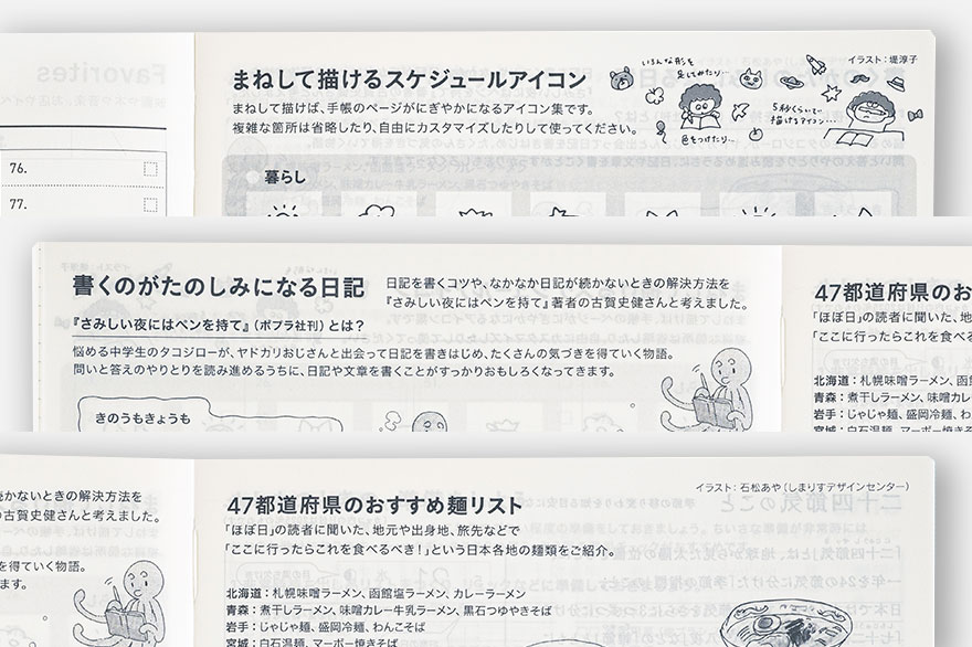 | Bonus Pages | Time Table / Graph Paper / Favorites / My 100 / Sample Symbols and Icons / How to Have Fun Keeping a Diary / Recommended Noodle List of 47 Prefectures / Solar Terms / Emergency Preparedness / Gifts / Age Table / Conversion Chart / Getting the most of Hobonichi / Addresses (for 8 people) / Personal Notes |