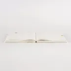 The book has the same thread-stitch binding as a dictionary, allowing it to lay flat open for comfortable writing. It stays flat even if you don’t hold it down.