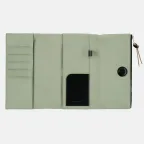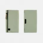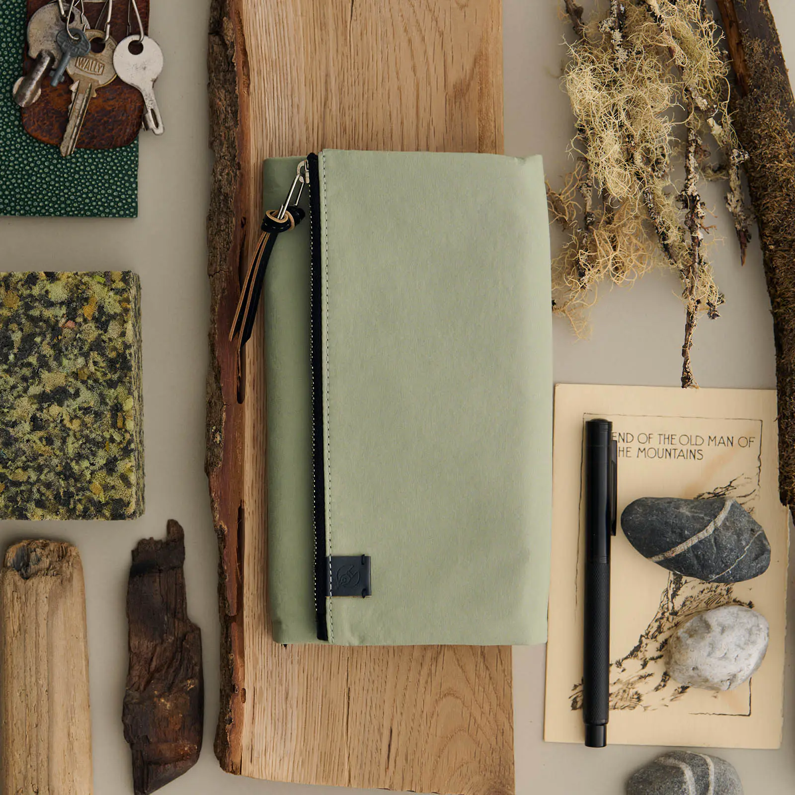 Its standout feature is the generously sized pocket, but its overall appearance remains clean and minimal. With its calming and gentle oakmoss color, the design is versatile and suits anyone. Though it folds into thirds and fastens with a magnetic closure, the cover is light in hand. The aim was effortless elegance, something that looks sharp without being flashy. The material is a soft nylon with a sophisticated sheen.