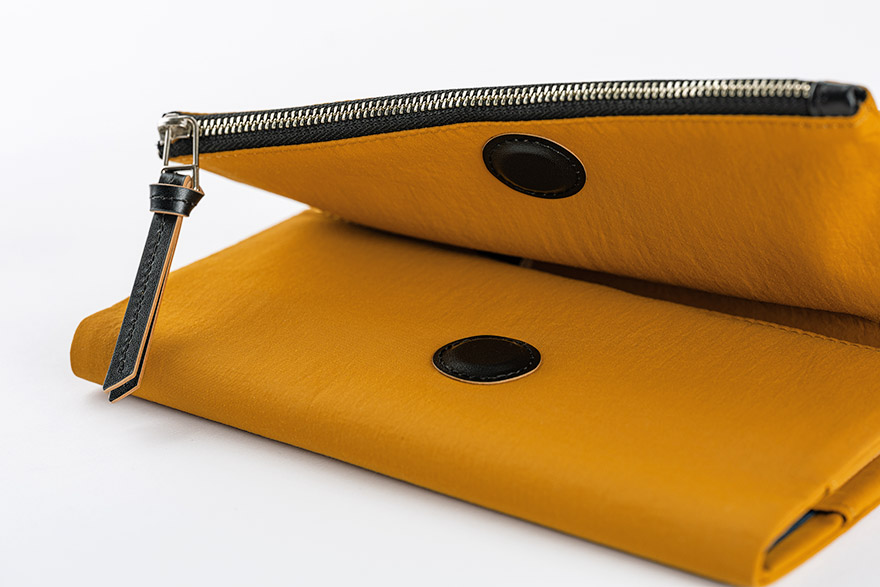 Its standout feature is the generously sized pocket, but its overall appearance remains clean and minimal. The vibrant yet subdued mustard color gives it a beautiful finish that suits anyone, regardless of style. Though it folds into thirds and fastens with a magnetic closure, the cover is light in hand. The aim was effortless elegance, something that looks sharp without being flashy. The material is a soft nylon with a sophisticated sheen.