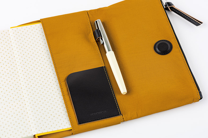 The cover closes with a hidden magnet, which is padded with a leather patch for a softer touch. The outer pocket also features a leather zipper pull.