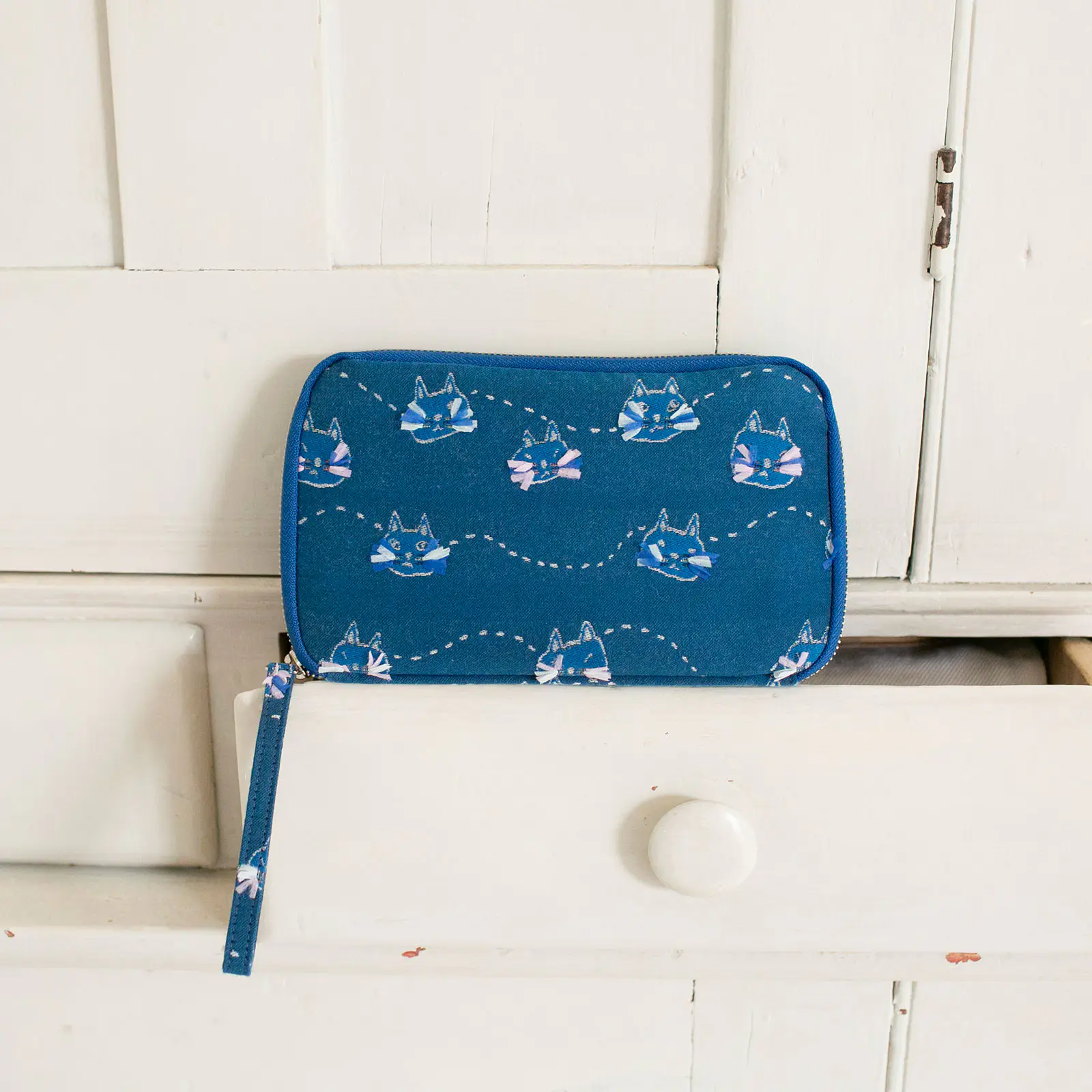 Whisker Cat places stitched images of cute cats and wavy lines against a deep blue background. The cats’ whiskers are made with white, pink, and light blue threads that have been cut one by one to the perfect length so you can enjoy the feel of the 3D effect against your fingertips. Look closely and you’ll see the faces of the cats vary, including some with wide eyes and some with narrowed eyes. The interior has a lustrous pink material to provide a charming contrast against the blue every time you open the pouch.