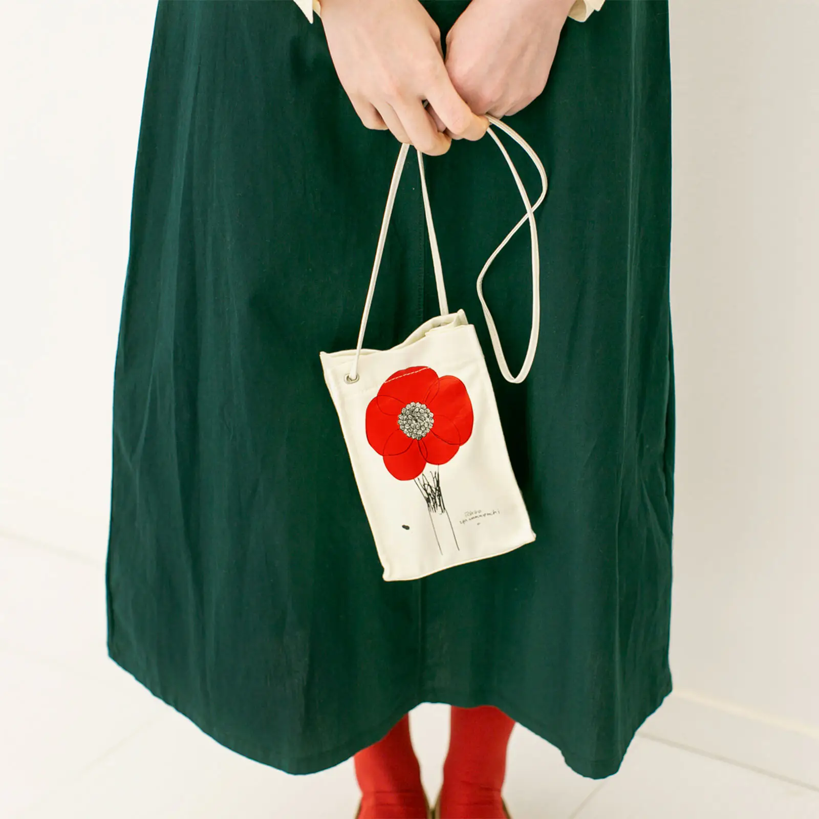 The outer material is made with a white material reminiscent of a brand new canvas, and the flowers are drawn with strong, black lineart. The flower petals are an eye-catching shade of vivid red. Gazing at these red flowers bursting with energy can put you in a bright and cheerful mood every day.