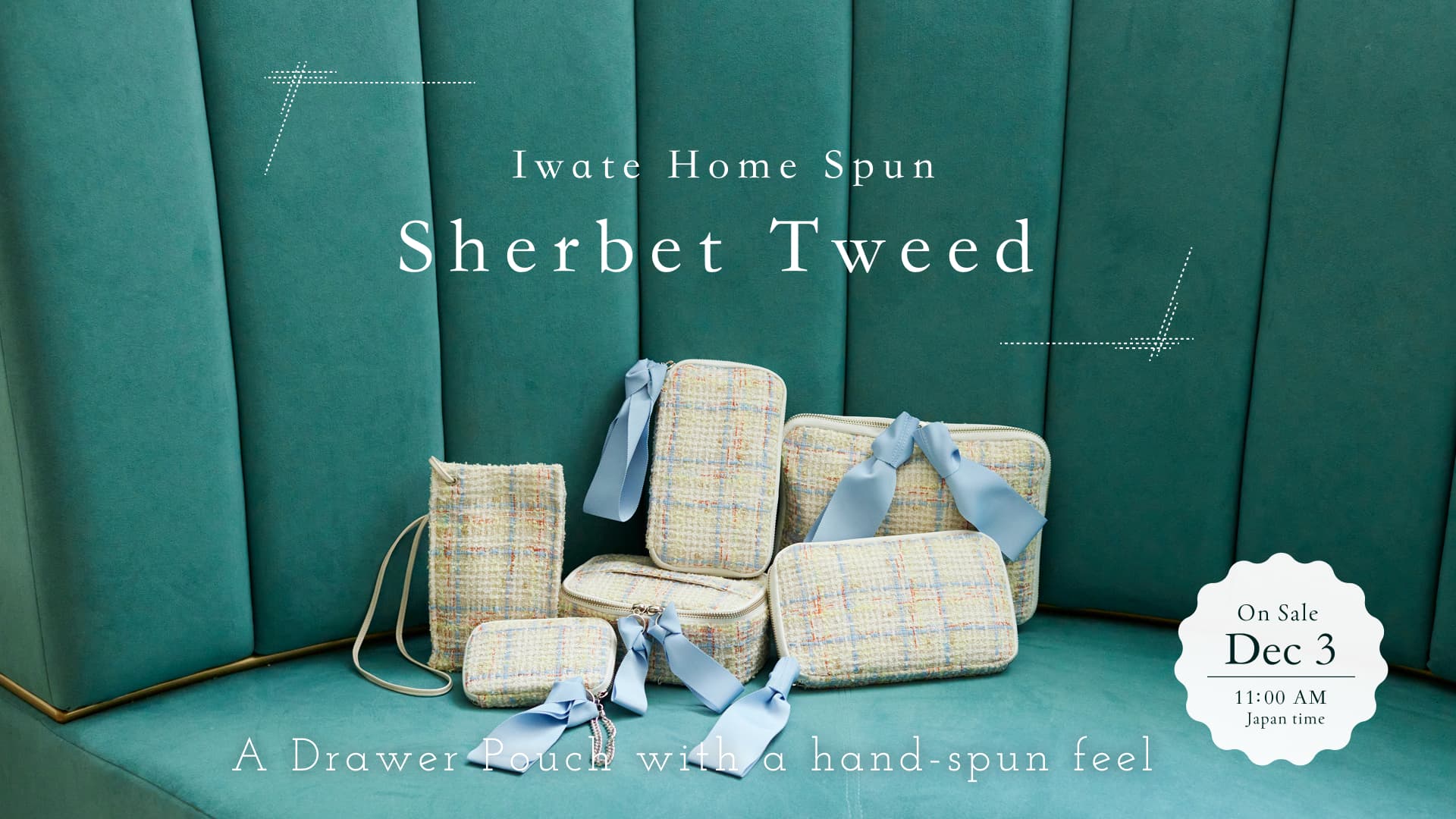 “Iwate Home Spun: Sherbet Tweed” is a refreshing tweed fabric woven on a white base, using threads dyed in light blue, yellow, red, pink, and more, along with shimmering gold lamé threads.