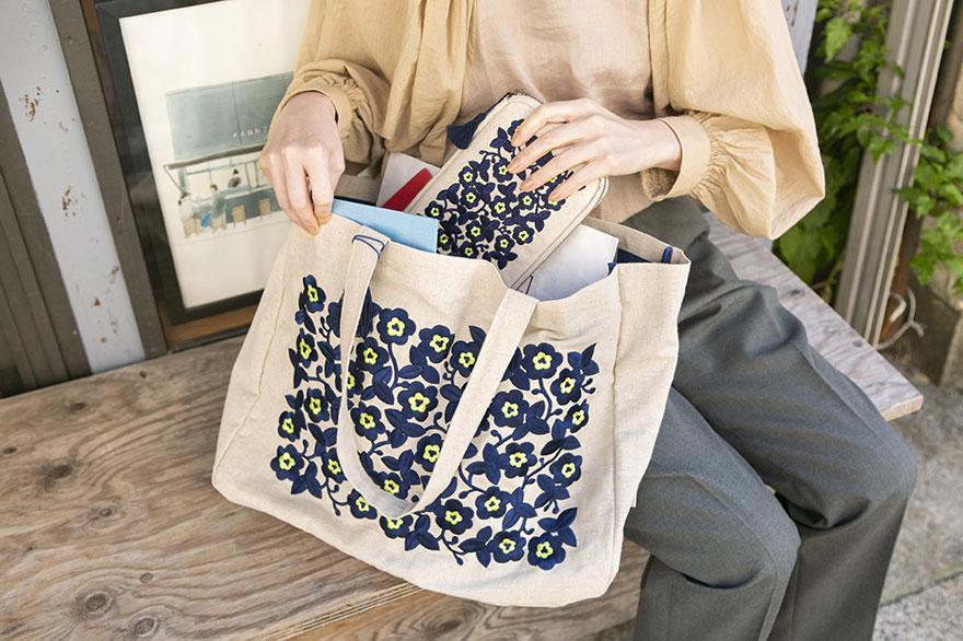 Ukrainian Flowers was a hit design when it was featured on a Hobonichi Techo cover. The floral design is based on the beautiful embroidery of traditional Ukrainian clothing, sorochka. It has a simple linen material embroidered with navy and neon yellow threads. The interior is navy, and the handles include a navy tassel to match the color of the embroidery.