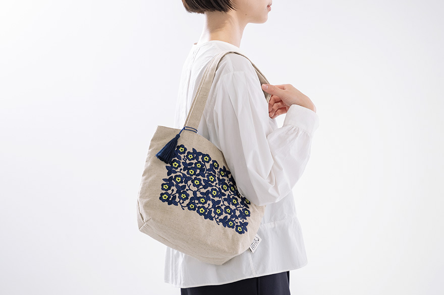 Ukrainian Flowers was a hitdesign when it was featured on a Hobonichi Techo cover. The floral design is based on the beautiful embroidery of traditional Ukrainian clothing, sorochka. It has a simple linen material embroidered with navy and neon yellow threads. The interior isnavy, and the handles include a navy tassel to match the color of the embroidery.