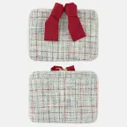 Glittering lamé yarn, silk threads, washi paper, and other threads of varying strength and materials are all woven together in a meticulous process about 1/3 the normal weaving speed. This slow speed allows the material to retain air and keep a soft, pleasant fluff. The handle includes a broad ribbon, and the interior is a warm red.