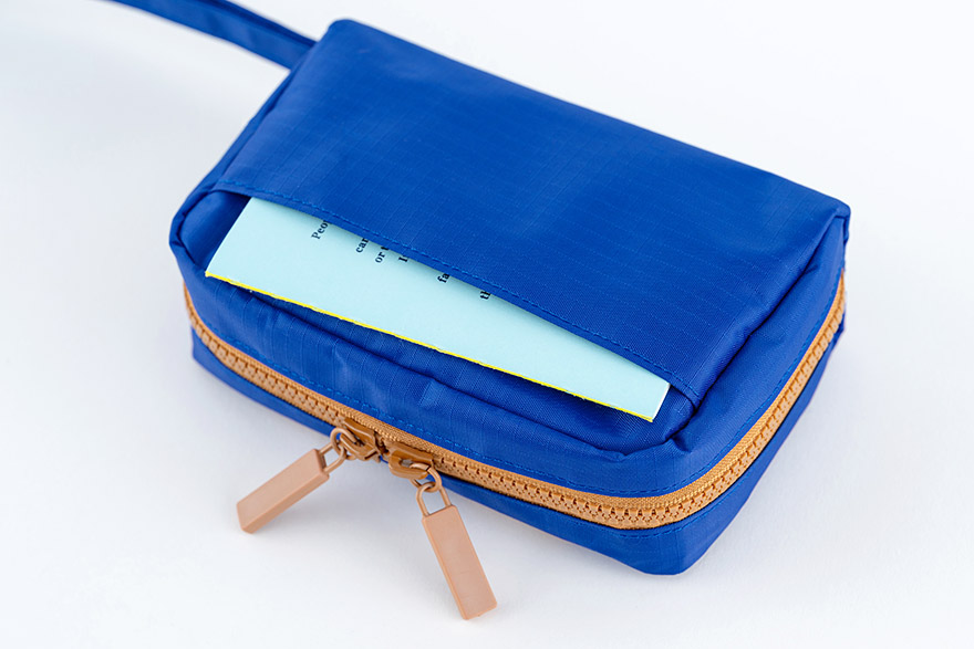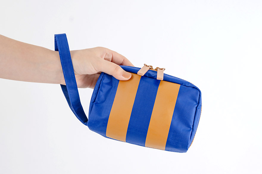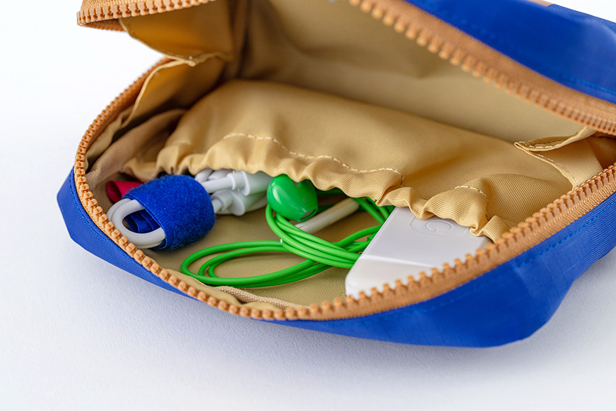 It’s light and sturdy, made with a nylon material with special backing treatment and designed in a way that allows the pouch to stand on its own so you can easily access the contents.