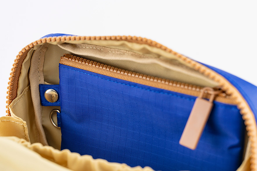 The double zipper allows the pouch to open completely to accommodate the generous space. Excluding any dividers in the pouch was a conscious decision, to keep a structure that can fit bulky items.