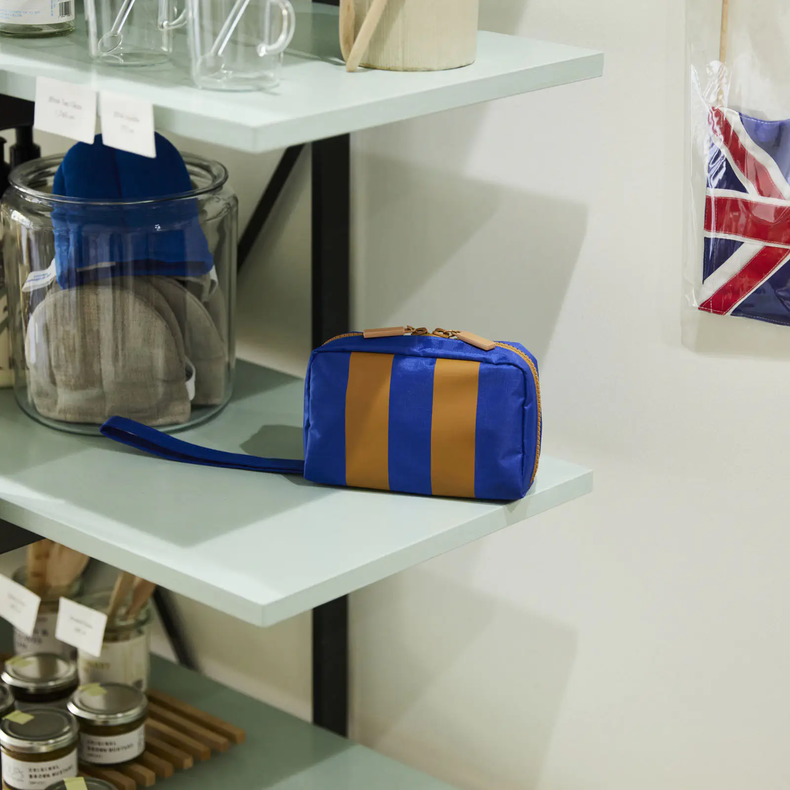 The “Box” type comes in two colorways: Stripes or Mint. Stripes has broad stripes in blue and caramel-color on the front, while the back is a solid blue. The zipper is caramel-color, and the interior is beige.