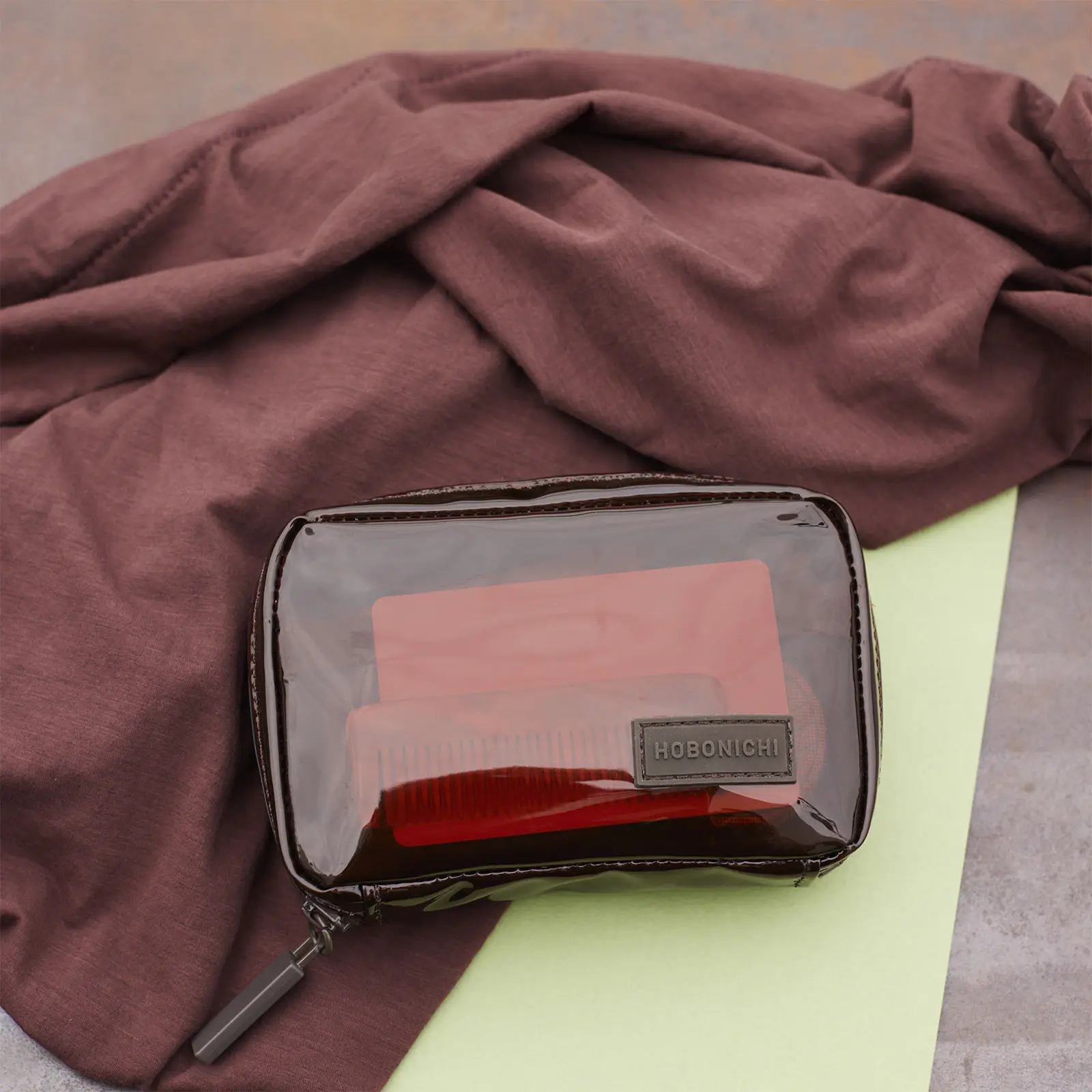 The Clear Brown is a casual and lightweight Drawer Pouch made from chocolate-toned brown vinyl material. Compared to fabric, it’s more water-resistant, making it perfect for outings, sports, and other active situations. The zipper is color-coordinated for a refined, grown-up look with a chic nuance. The inner pockets are made with a fine mesh material, allowing the contents to be just slightly visible—offering both fun and functionality. As a finishing touch, the pouch is accented with a silicone HOBONICHI label.
