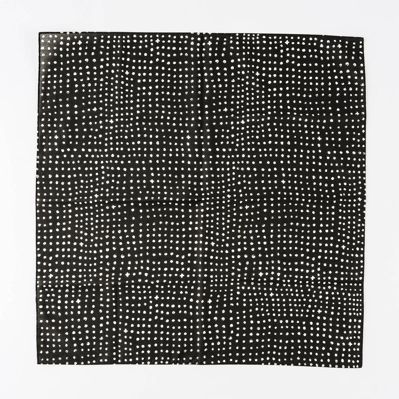 Painted with free-flowing brushstrokes, white dots stand out boldly against a black background. Though the design is refreshingly simple, with no extra embellishment, the subtle wavering and fading of the hand-drawn lines bring a gentle warmth to the overall look.