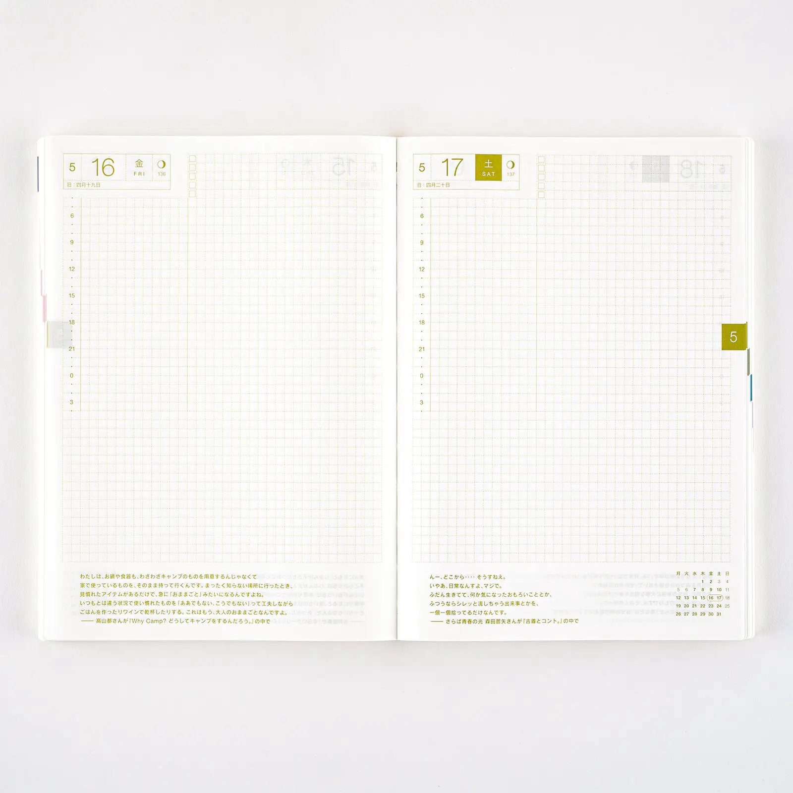 | Bonus Pages | Time Table / Graph Paper / Favorites / My 100 / Sample Symbols and Icons / How to Have Fun Keeping a Diary / Recommended Noodle List of 47 Prefectures / Solar Terms / Emergency Preparedness / Gifts / Age Table / Conversion Chart / Getting the most of Hobonichi / Addresses (for 8 people) / Personal Notes |