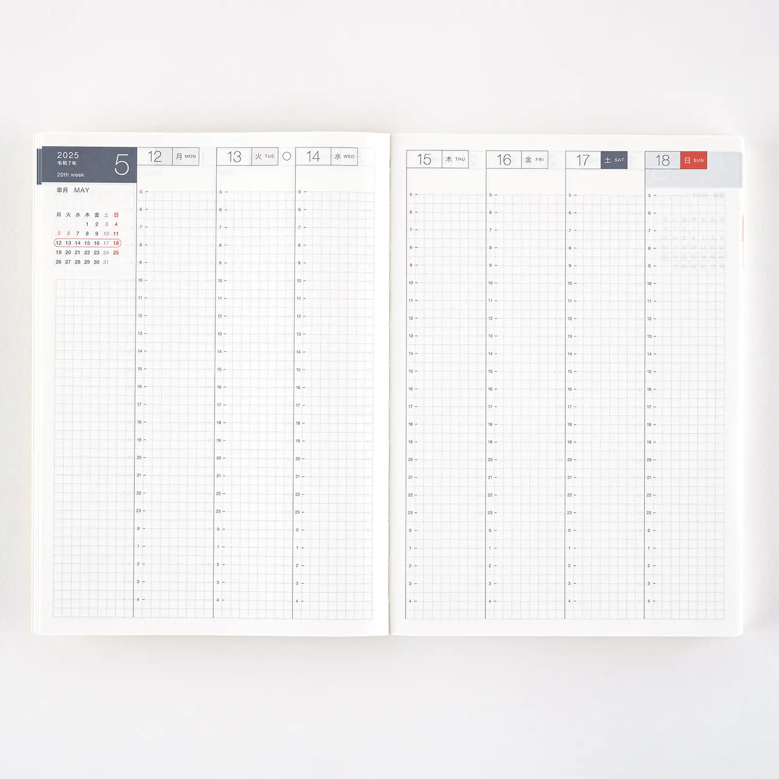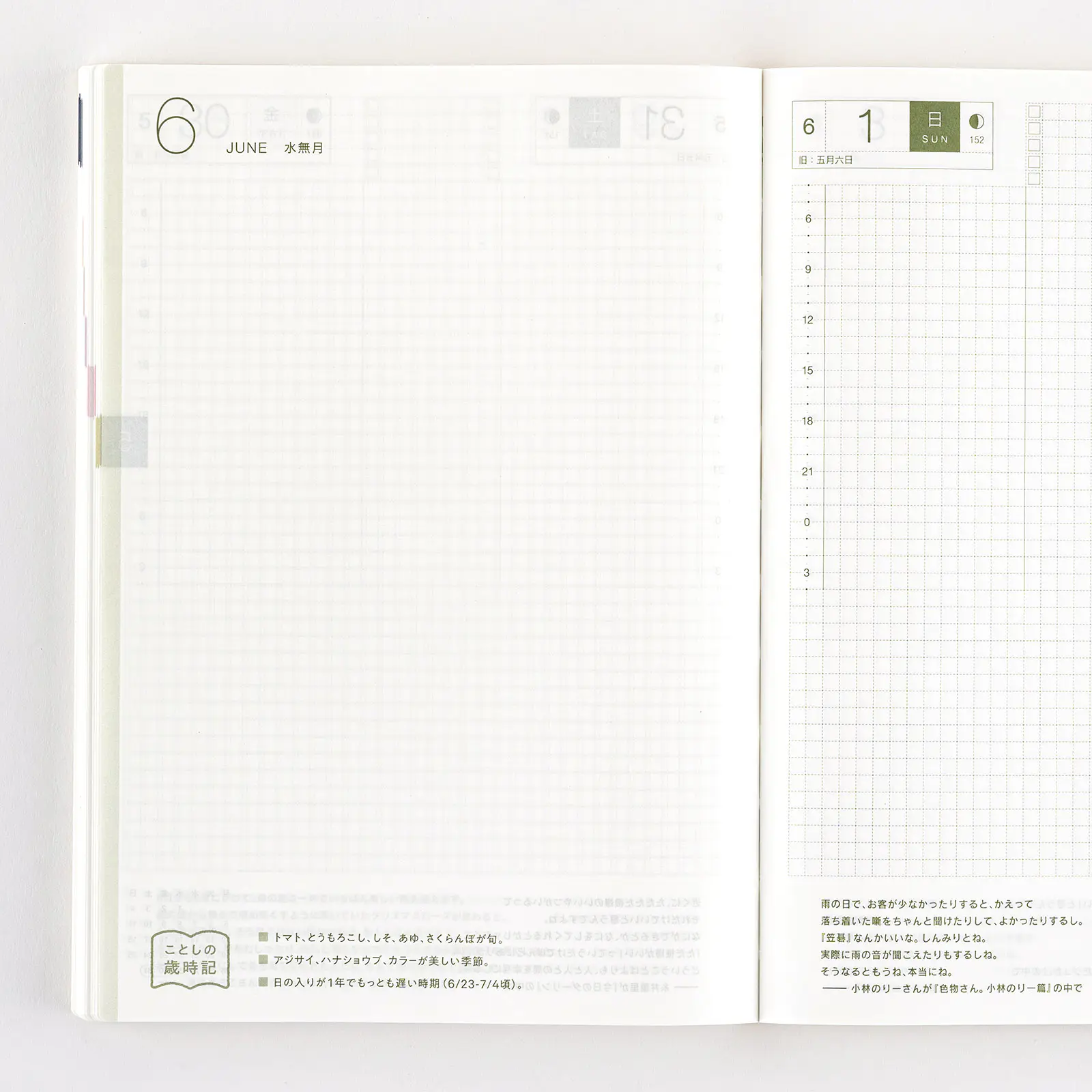 | Listed Information | Day of the year / Week of the year (listed on monthly calendars and weekly pages) / Old lunar calendar / Rokuyo (traditional Japanese lunisolar calendar) (listed on monthly calendars) / Solar terms / Japanese holidays / Moon phase (daily pages include every phase, monthly calendars and weekly pages only include full and new moon) |
