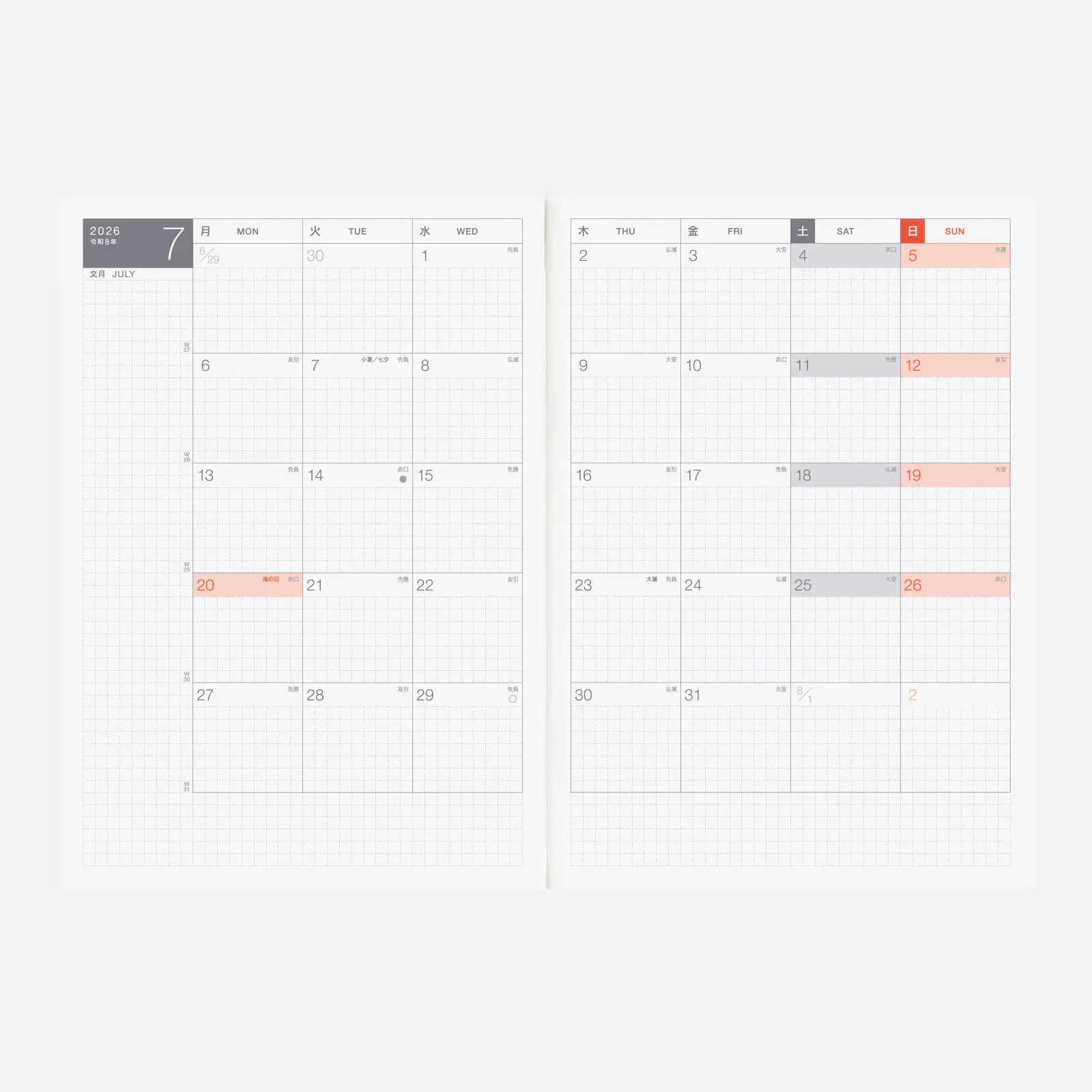 | Listed Information | Day of the year / Week of the year (listed on monthly calendars and weekly pages) / Old lunar calendar / Rokuyo (traditional Japanese lunisolar calendar) (listed on monthly calendars) / Solar terms / Japanese holidays / Moon phase (daily pages include every phase, monthly calendars and weekly pages only include full and new moon) |
