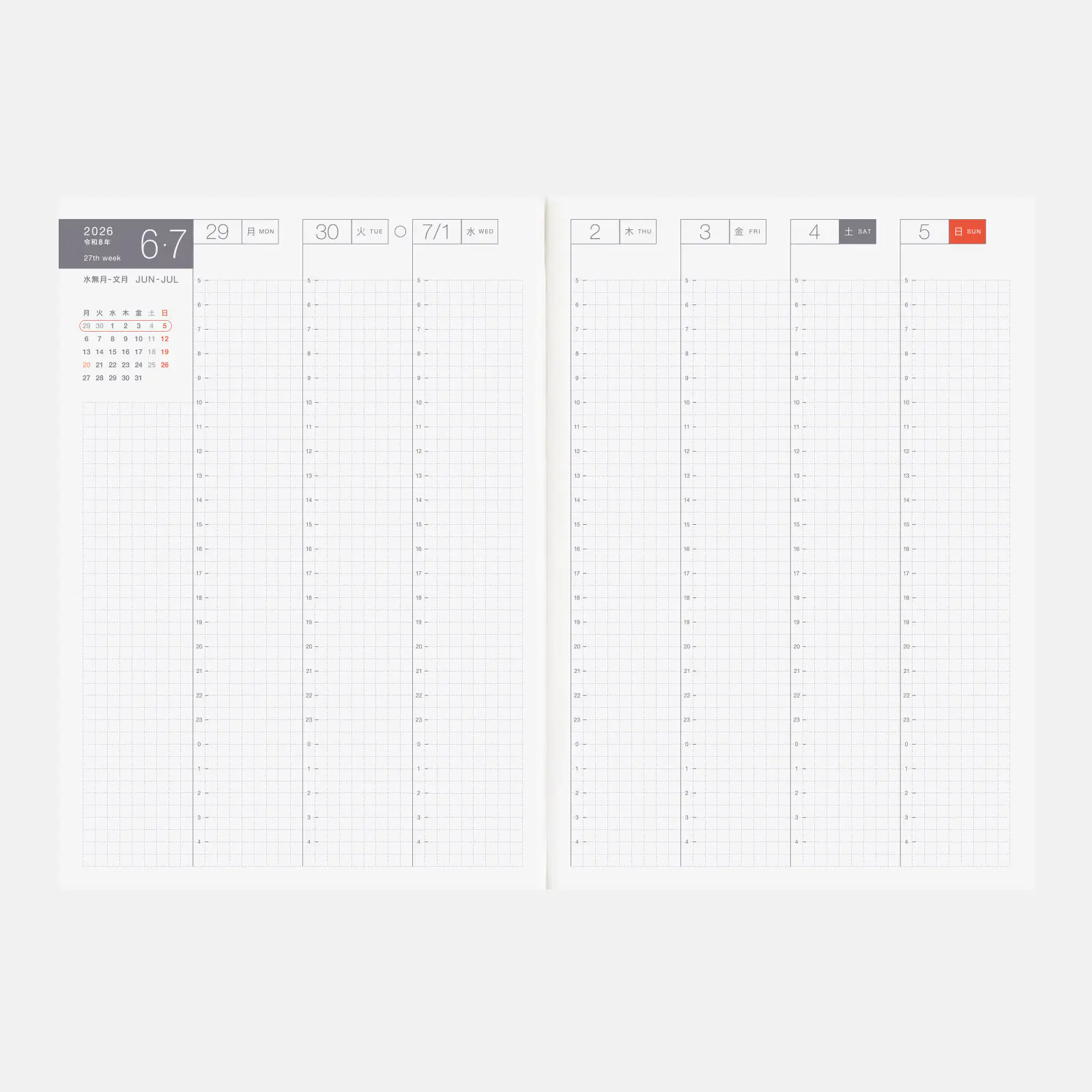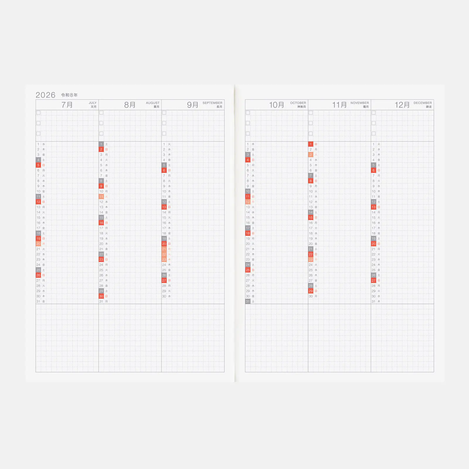 | Bonus Pages | Time Table / Graph Paper / Favorites / My 100 / Memories 2026 / 12 Switches to Help You Focus / For a Comfortable Night’s Sleep / Solar Terms / Emergency Preparedness / Gifts / Age Table / Conversion Chart / Getting the most of Hobonichi / Addresses / Personal Notes |