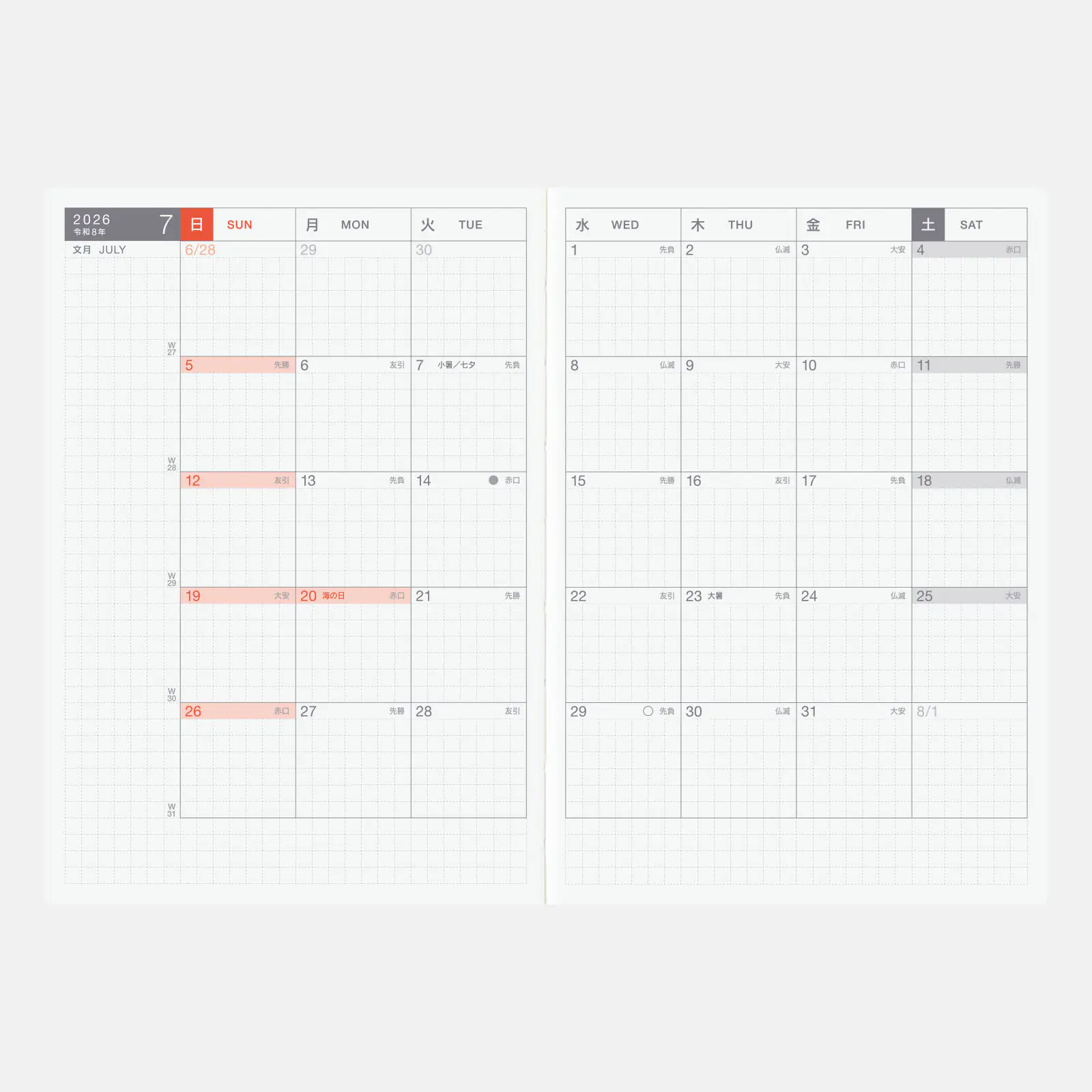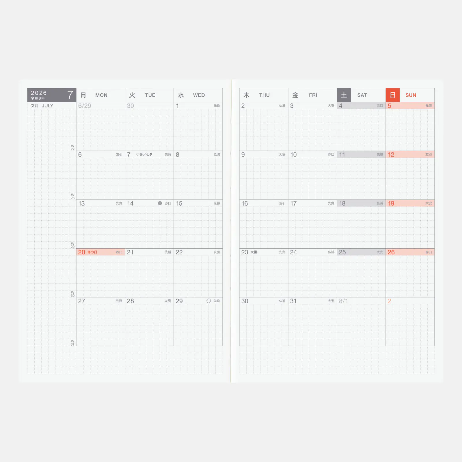 | Listed Information | Day of the year / Week of the year (listed on monthly calendars) / Old lunar calendar / Rokuyo (traditional Japanese lunisolar calendar) (listed on monthly calendars) / Solar terms / Japanese holidays / Moon phase (daily pages include every phase, monthly calendars only include full and new moon) |