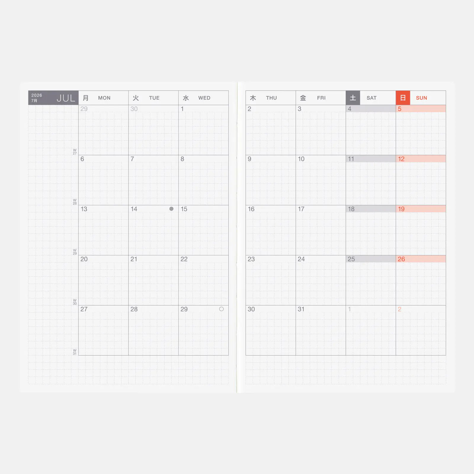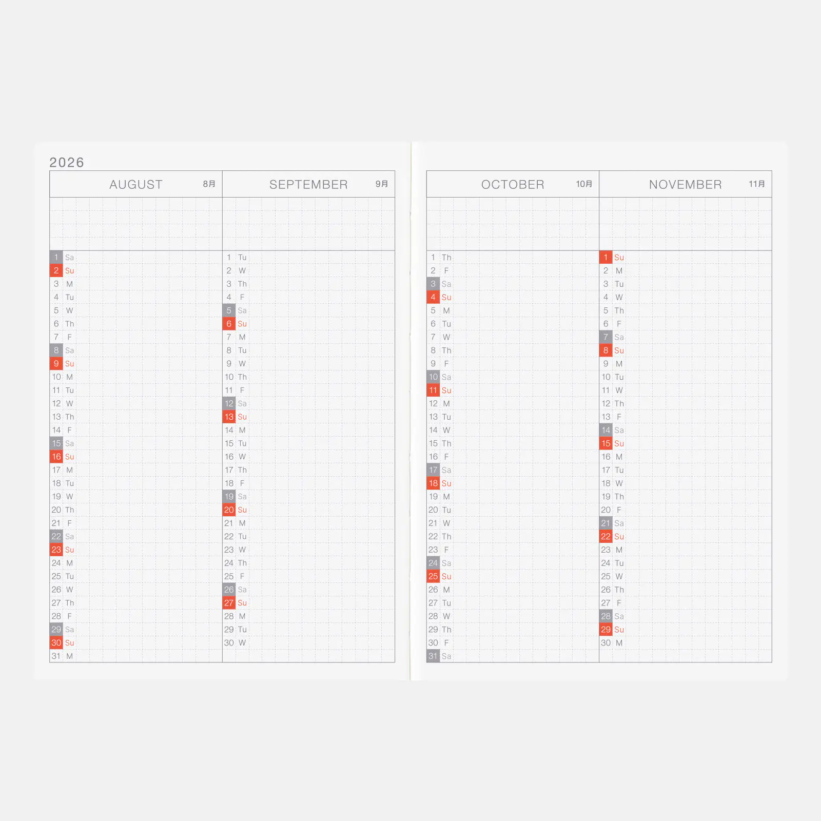 | Bonus Pages | Time Table / Graph Paper / Favorites / My 100 / Memories 2026 / 12 Switches to Help You Focus / For a Comfortable Night’s Sleep / Words to Remember / 365 Days Check-Off Sheet / Looking Back at the Year 2026 / Getting the Most Out of Your Hobonichi Techo / Gifts / Addresses / Personal Notes |