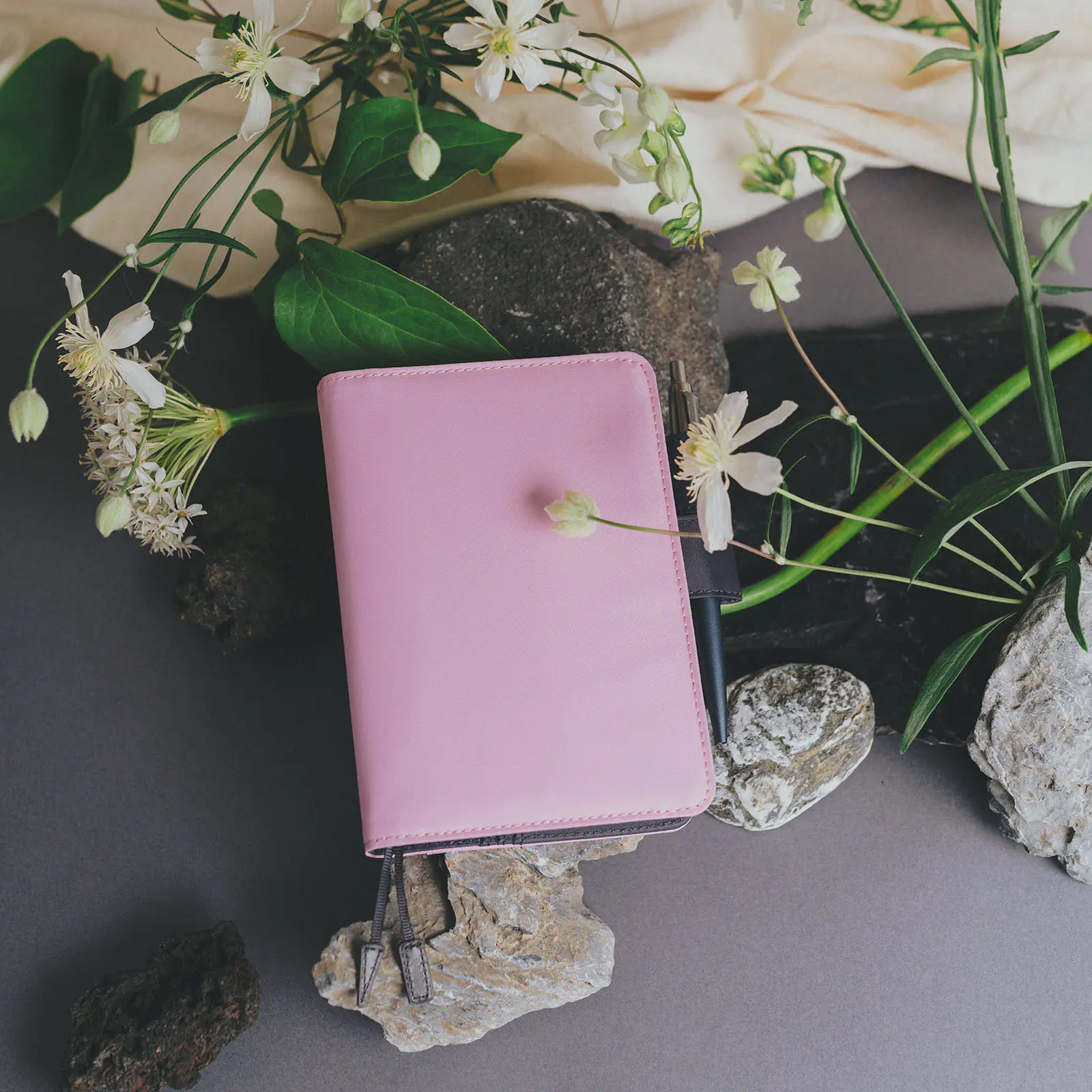 The cover contains two bookmarks, one with a rectangle charm and one with a triangle charm, so you can keep your place in two parts of the book, such as the monthly calendar and the daily page.