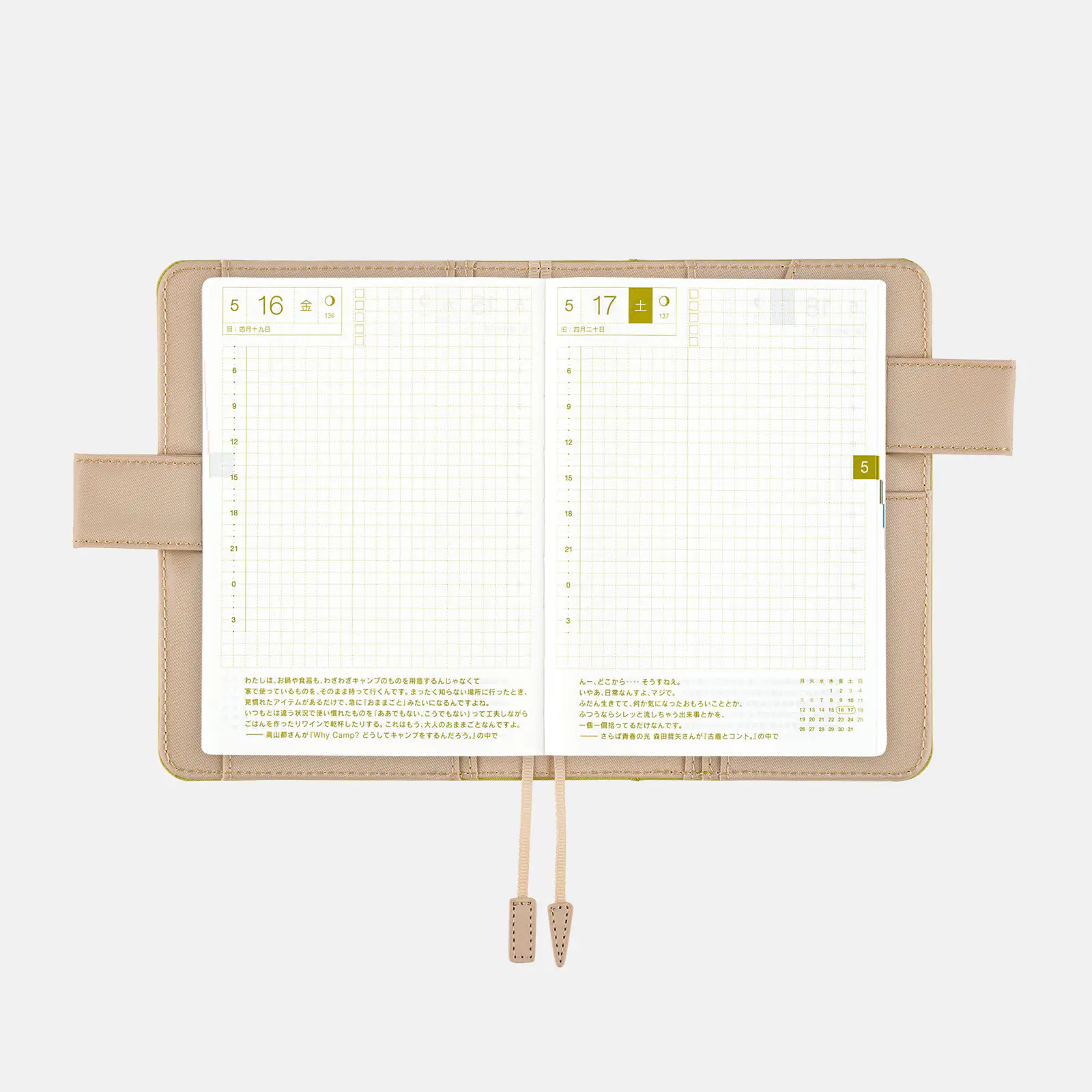 | Paper Type / Binding | Thin, light Tomoe River paper that is smooth to write on and designed for planners / Stitch-binding |