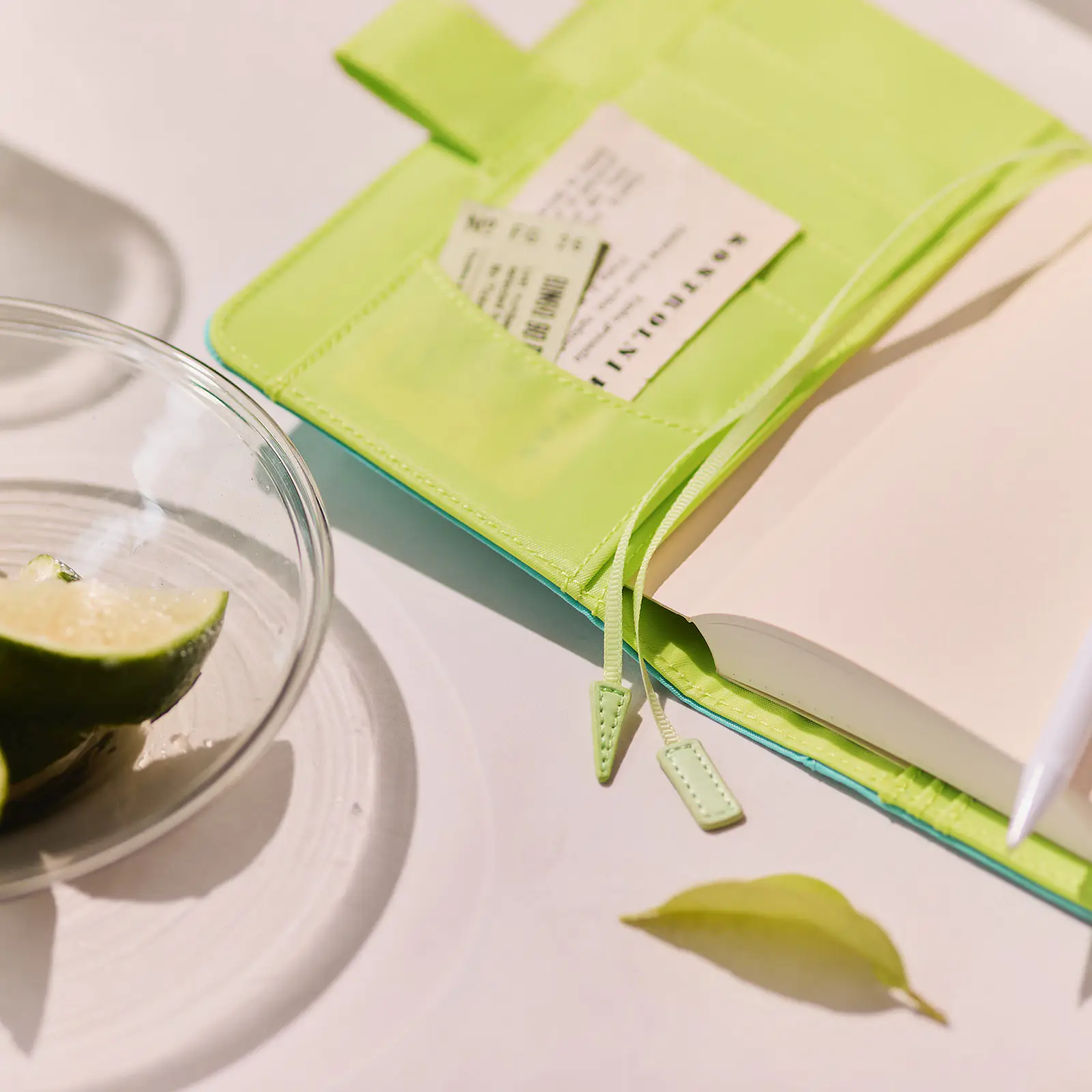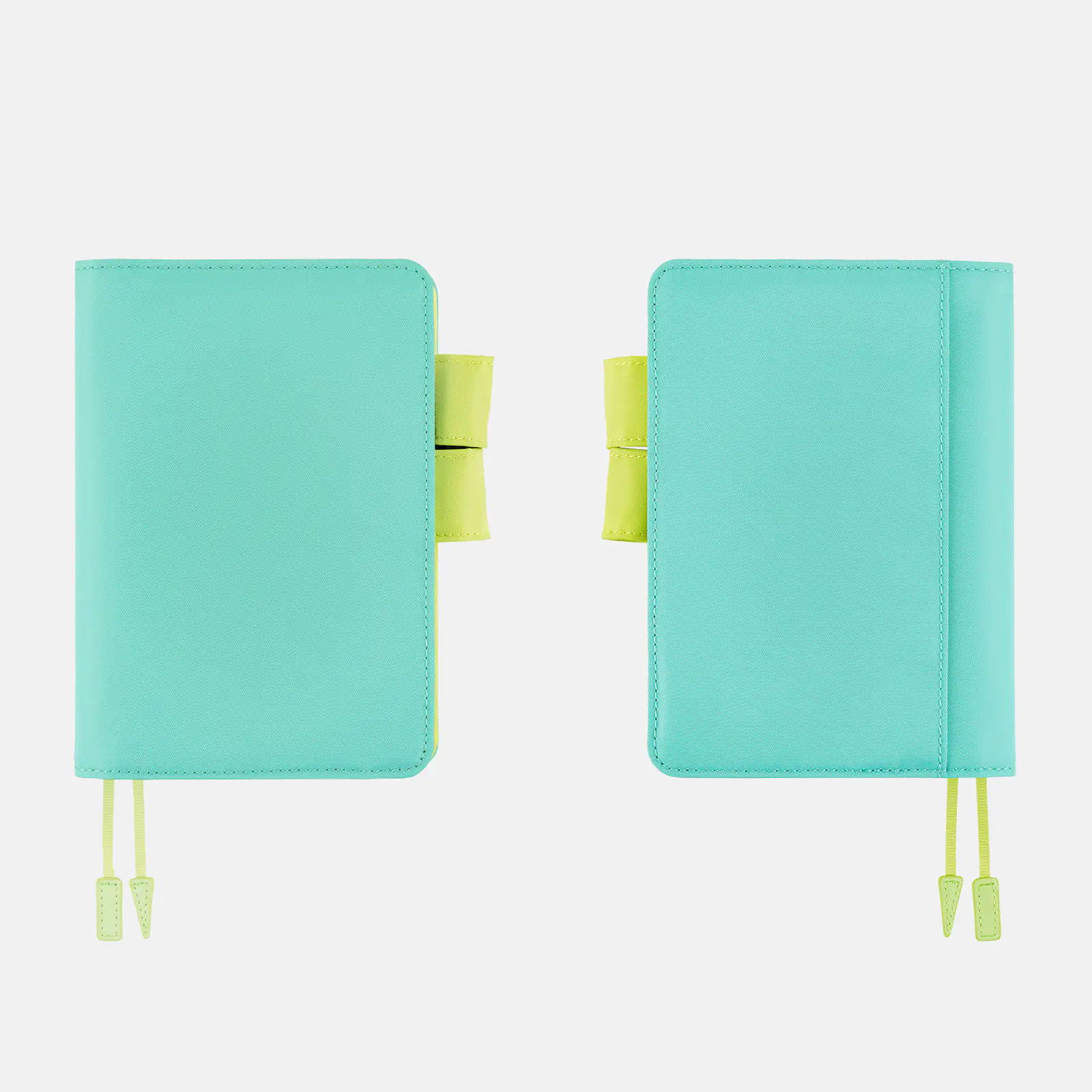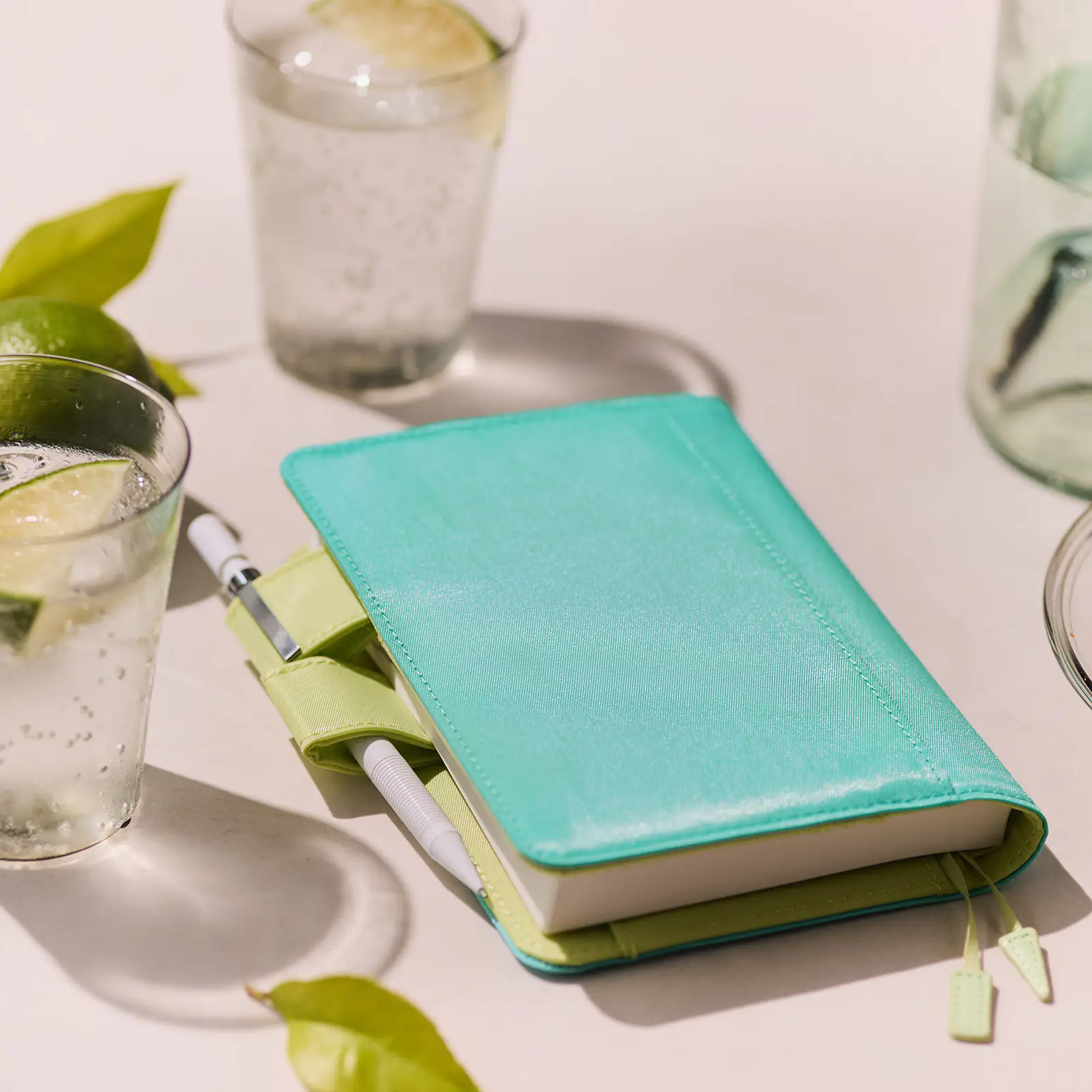 A clear, light blue with a green hue pairs up with a dazzling lime green in Aqua Lime. The color combination overflows with a sense of freshness, and the cover will make you feel refreshed and uplifted every time you use it.
