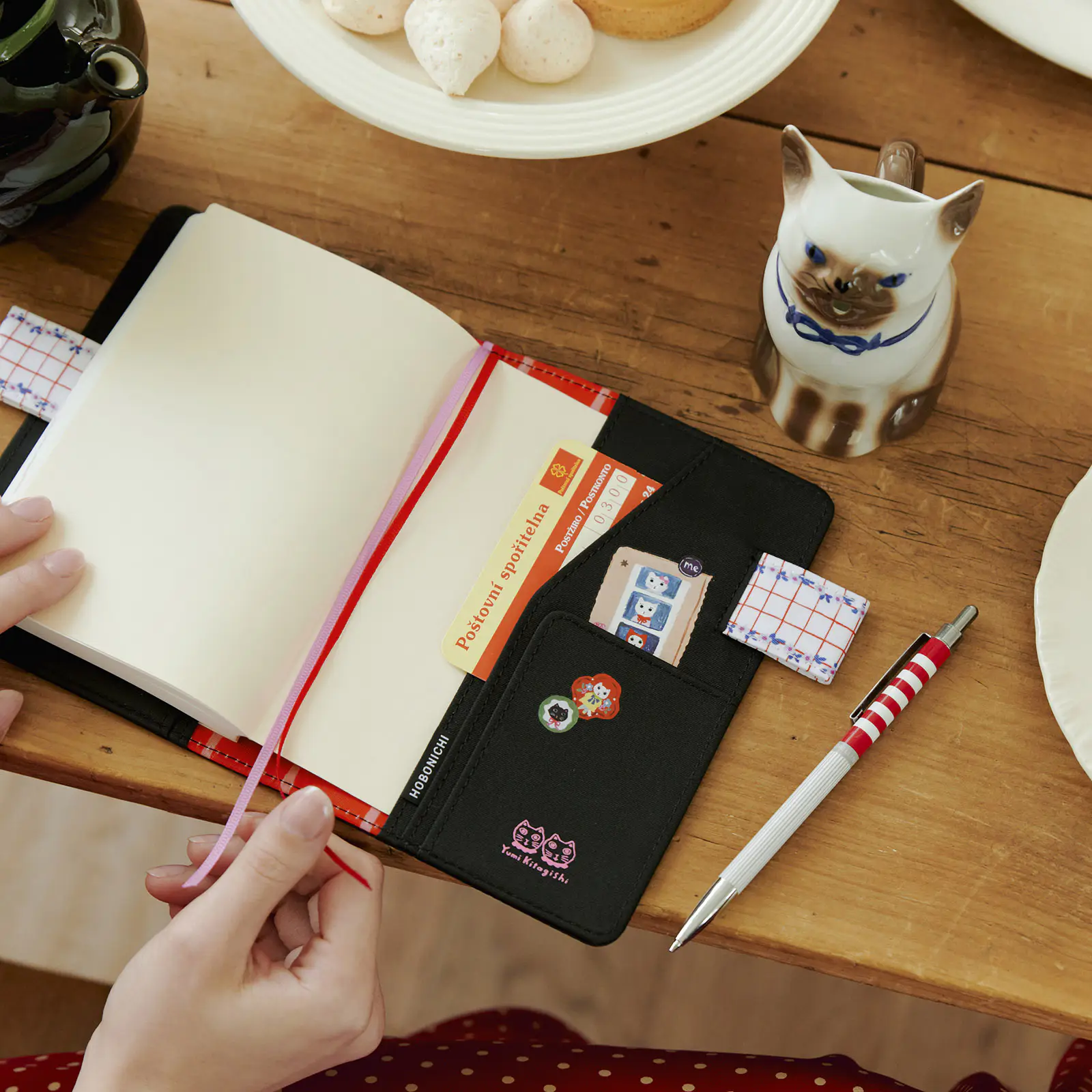 The cover interior comes in a red checkered pattern, which was also drawn by Kitagishi. The pocket on the right side is decorated with the white and black cats and there’s even a strip of film that features the little white cat. Once again included this year is an exclusive brand card with an original design. If you put it in one of the pockets, opening your techo every day will become even more fun.