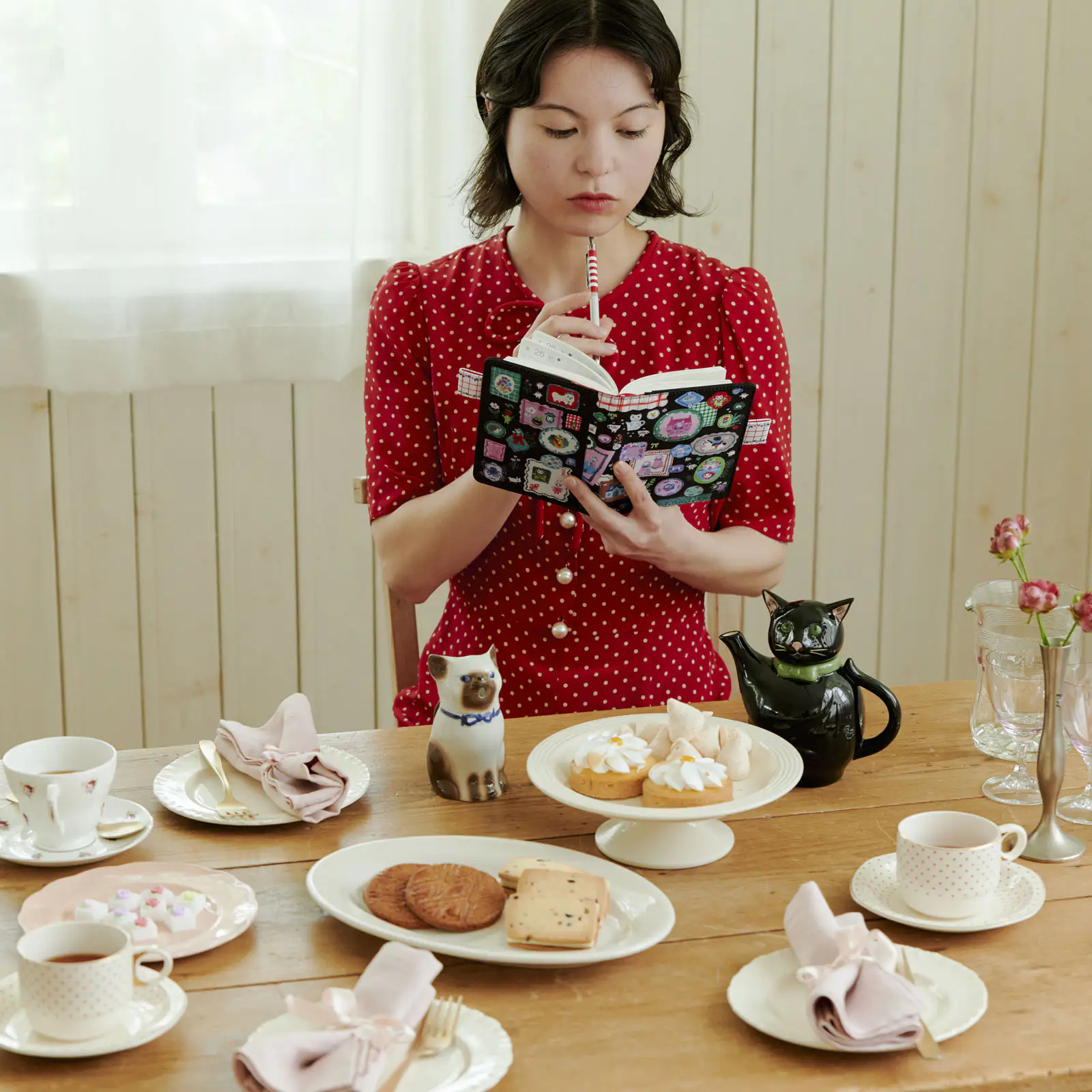 Lined up are a teapot shaped like a white cat and a teacup, a vase filled with beautiful flowers, a napkin bound with a ribbon…countless items that would add color and joy to any table.