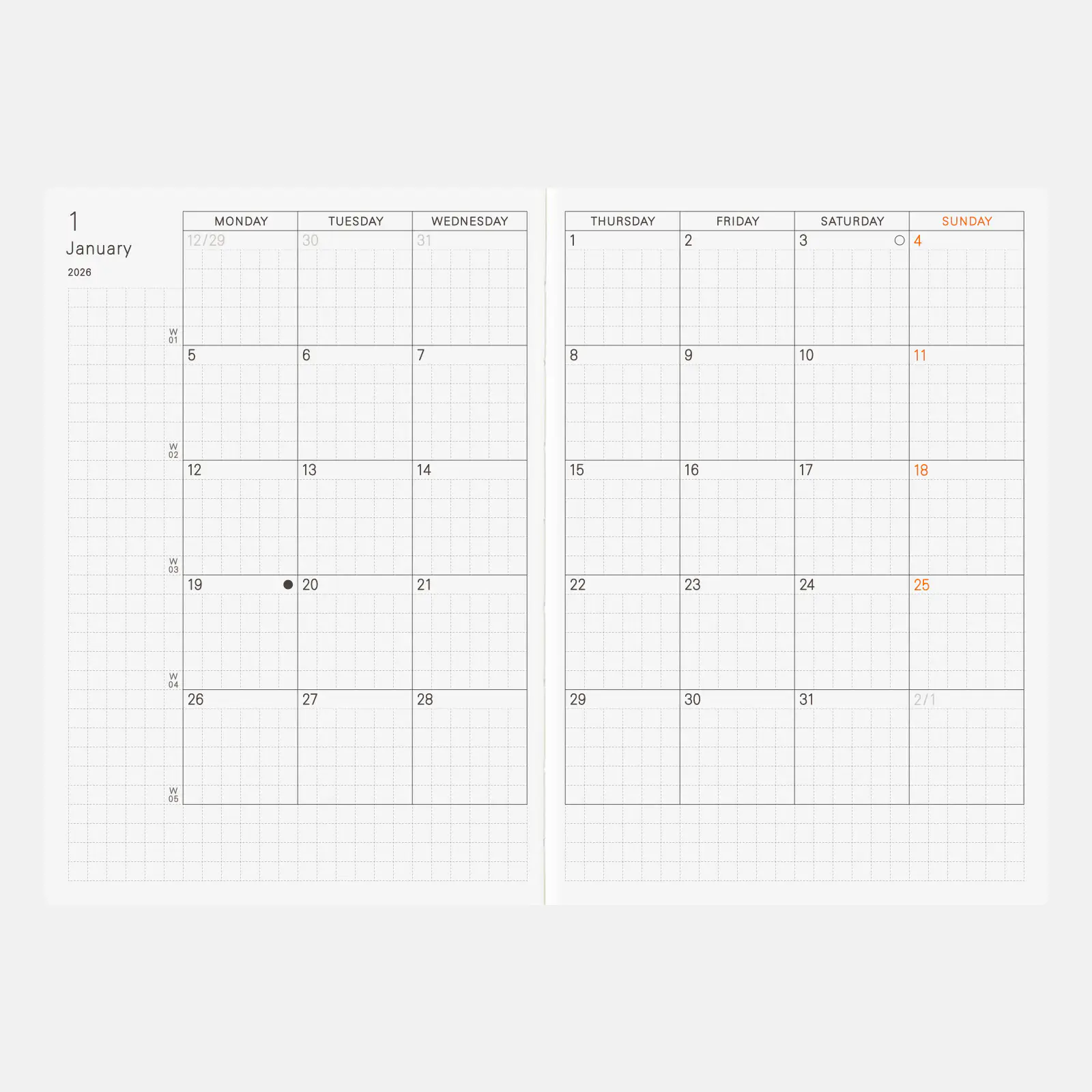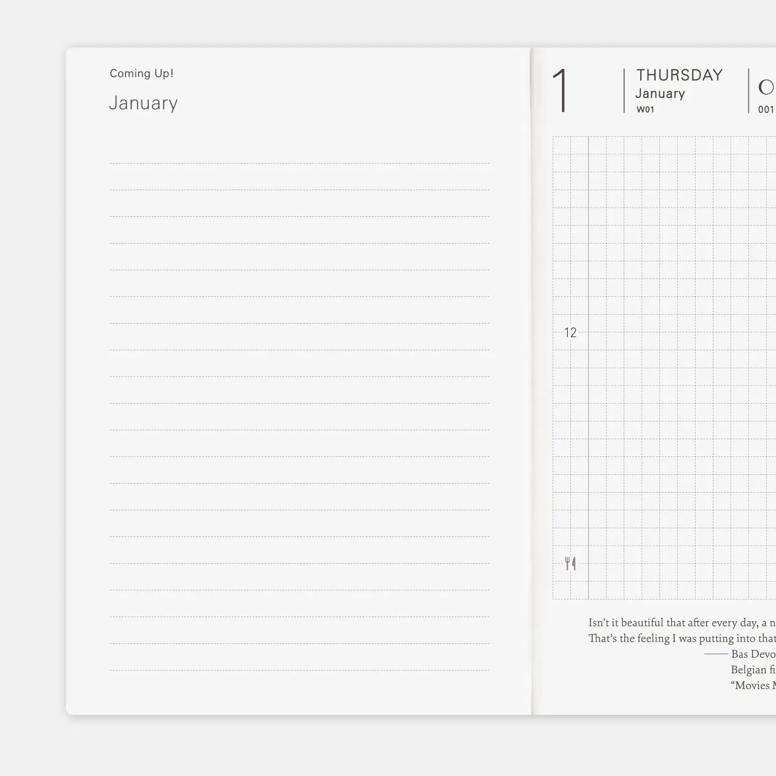 | Daily Pages | Jan. 1 - Dec. 31, 2026 (377 pages) *A page is included at the beginning of each month to help in planning ahead. *Every two-page daily page spread includes one daily quote. *Includes a mini monthly calendar at the bottom right of every two-page spread (Monday-start). *Additionally, a blank two-page spread is featured at the beginning to provide a free area when starting out the book. |
