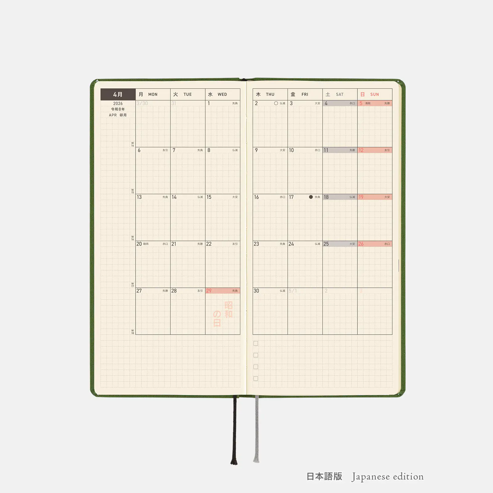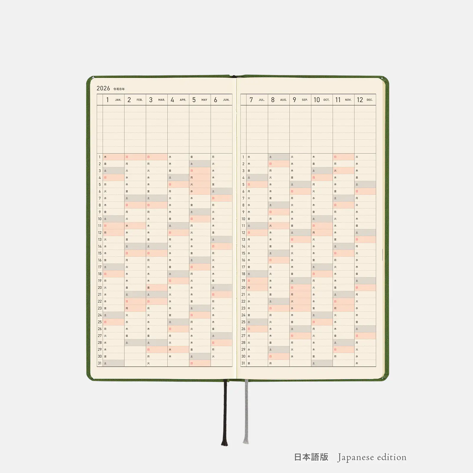 | Bonus Pages | 365 Days Check-Off Sheet / Using Things around You to Measure Size / My 100 / Memories 2026 / 12 Switches to Help You Focus / Solar Terms / Emergency Preparedness / Age Table / Conversion Chart / Getting the most of Hobonichi / Contact List / Personal Notes |
