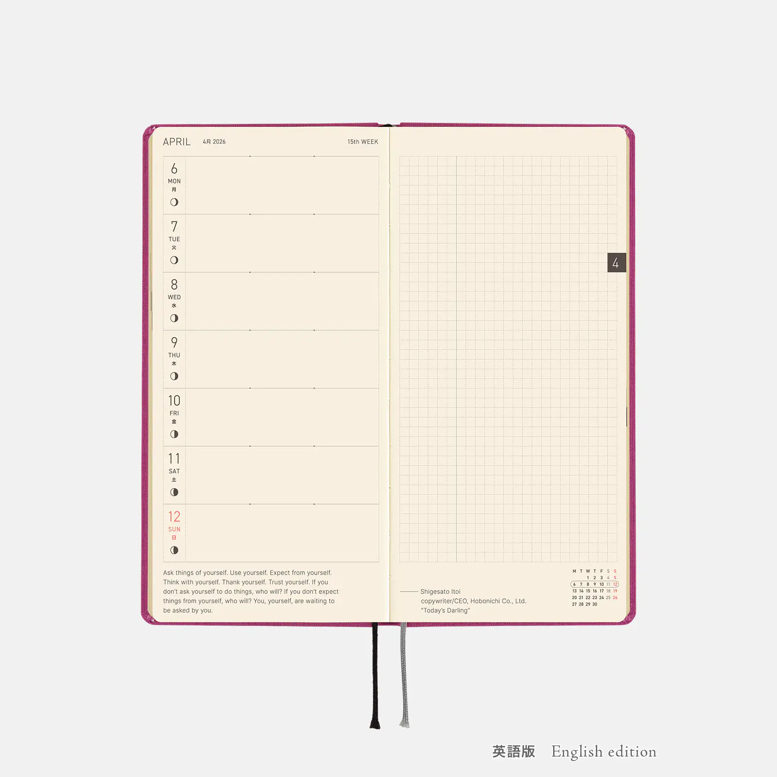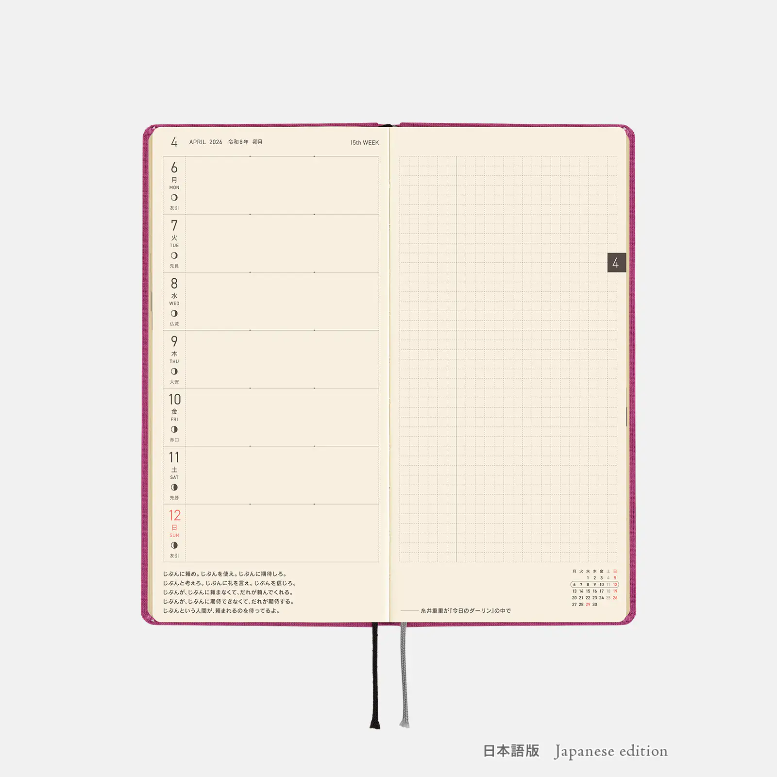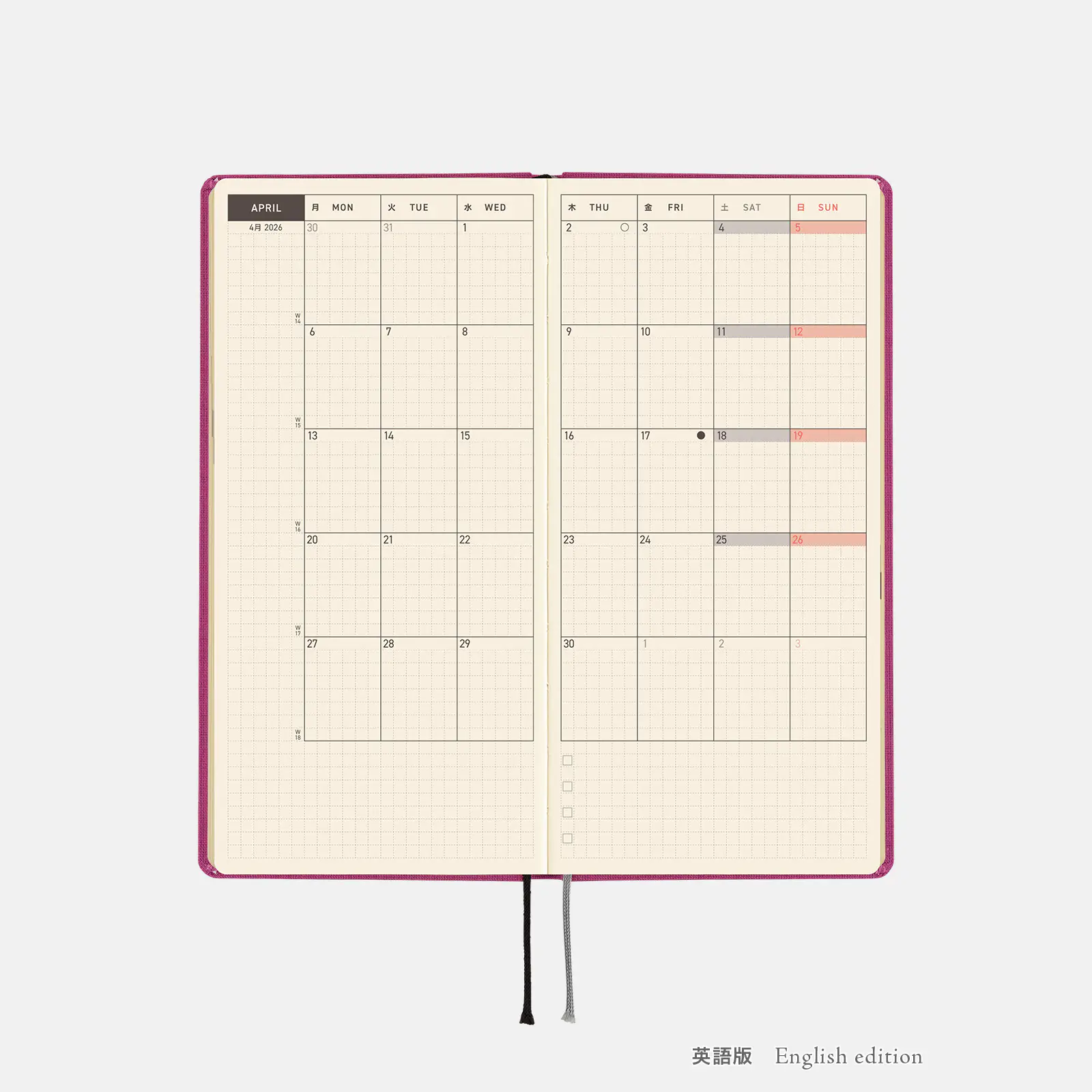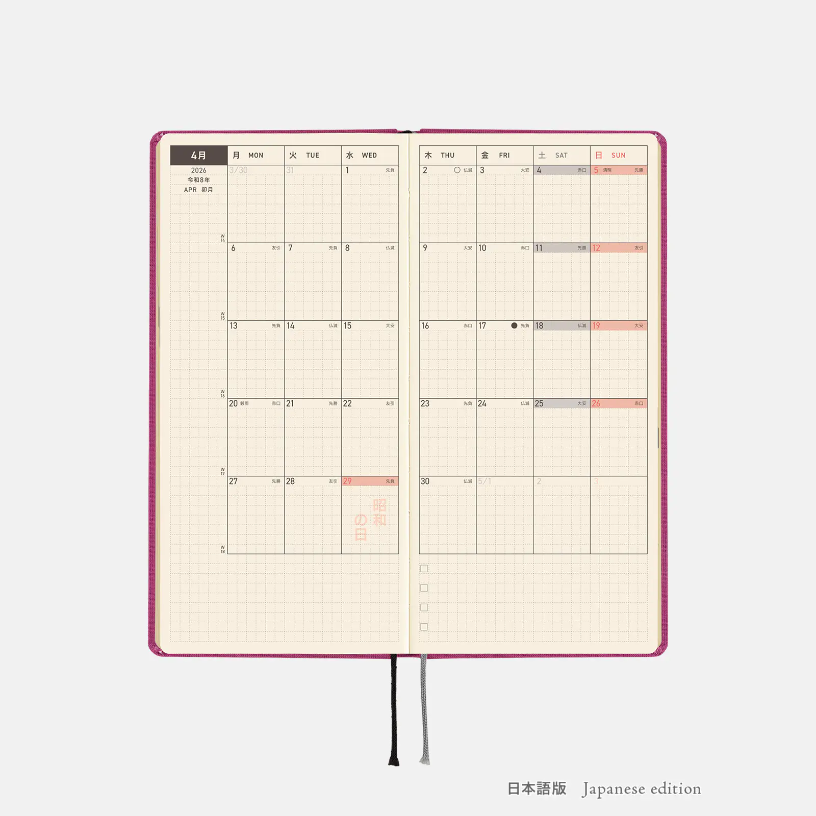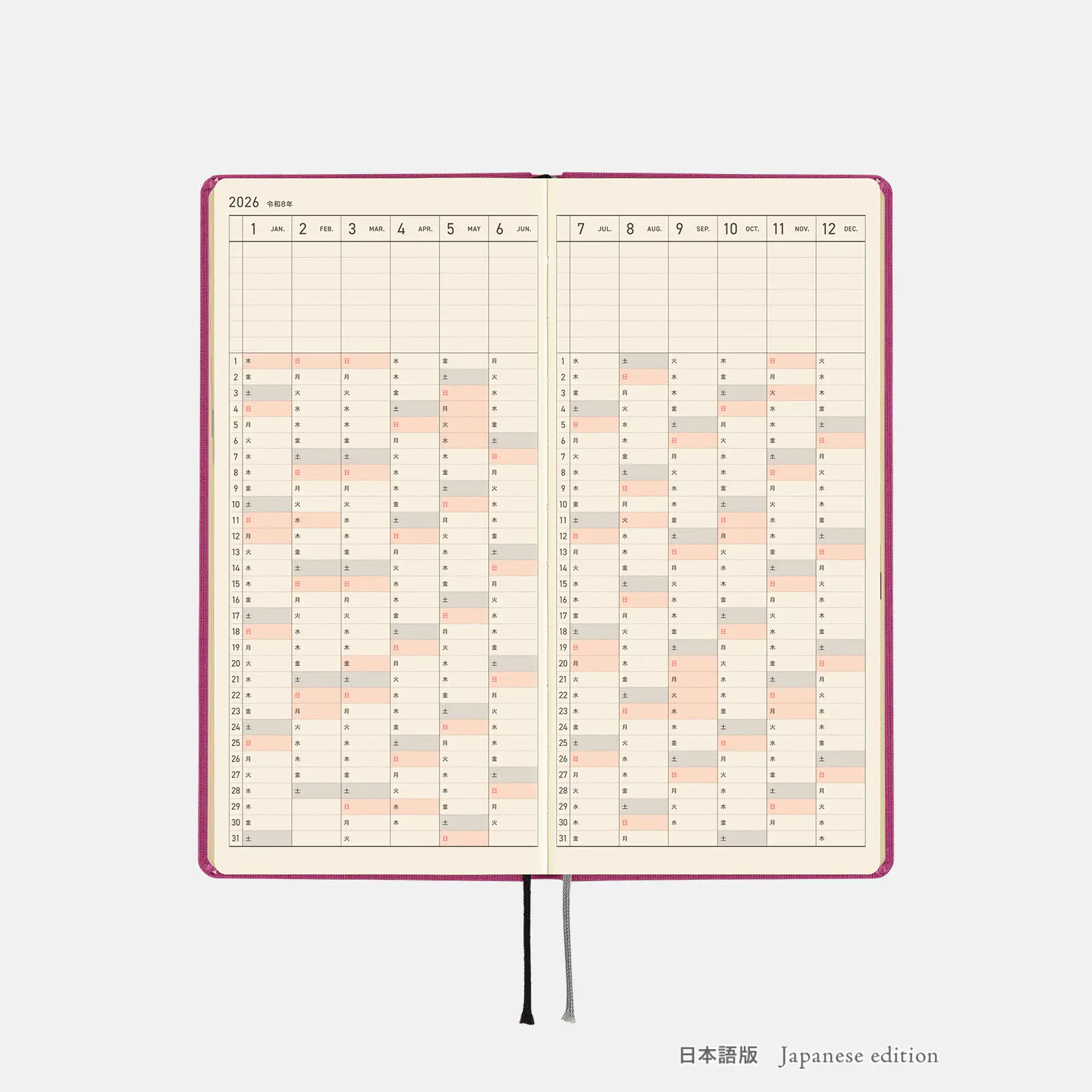 | Bonus Pages | 365 Days Check-Off Sheet / Using Things around You to Measure Size / My 100 / Memories 2026 / 12 Switches to Help You Focus / Solar Terms / Emergency Preparedness / Age Table / Conversion Chart / Getting the most of Hobonichi / Contact List / Personal Notes |