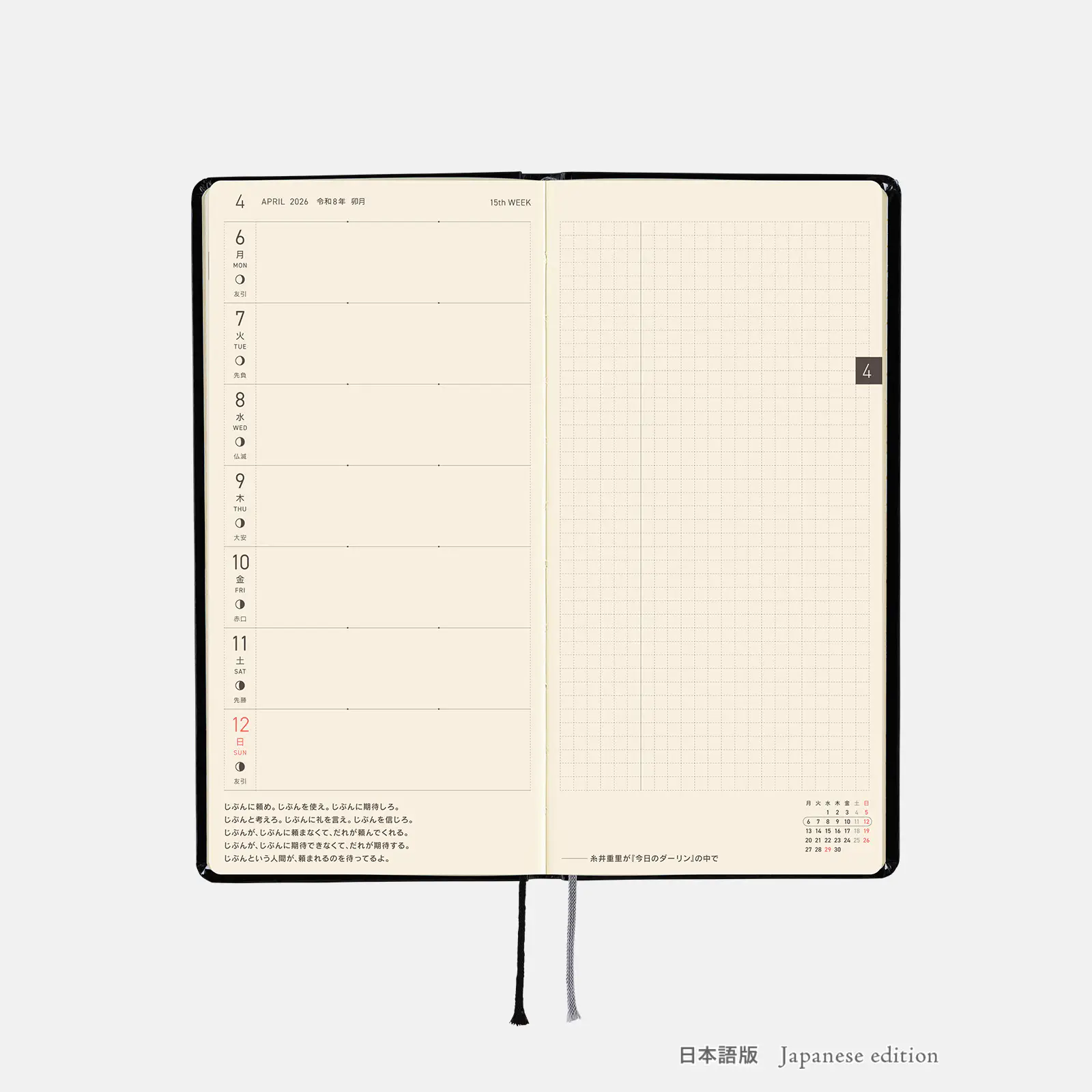 The Weeks book has space for writing in plans or journal entries, and it also has plenty of grid paper memo pages in the back. The back of the book contains bonus pages, including Memories 2026 and 12 Switches to Help You Focus.