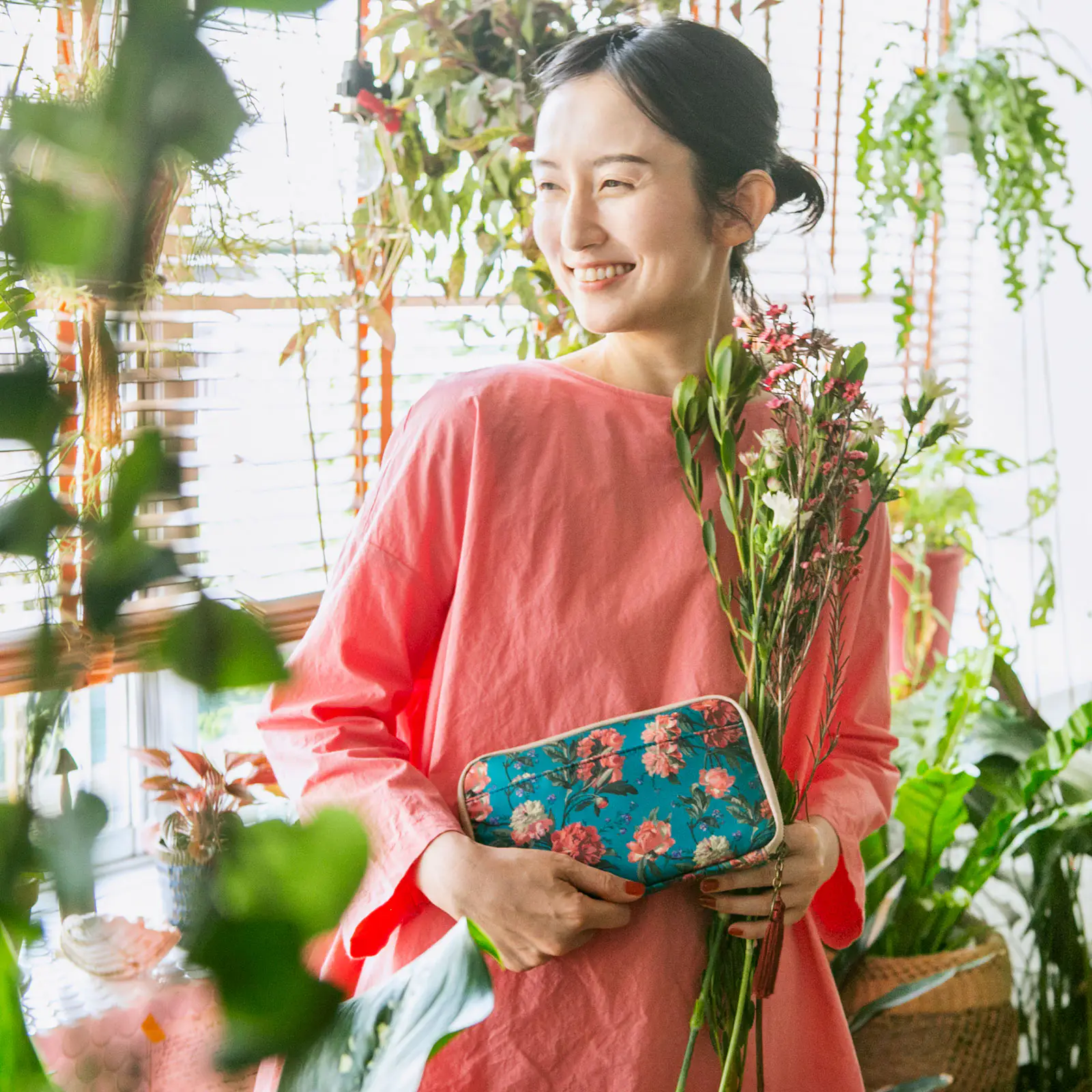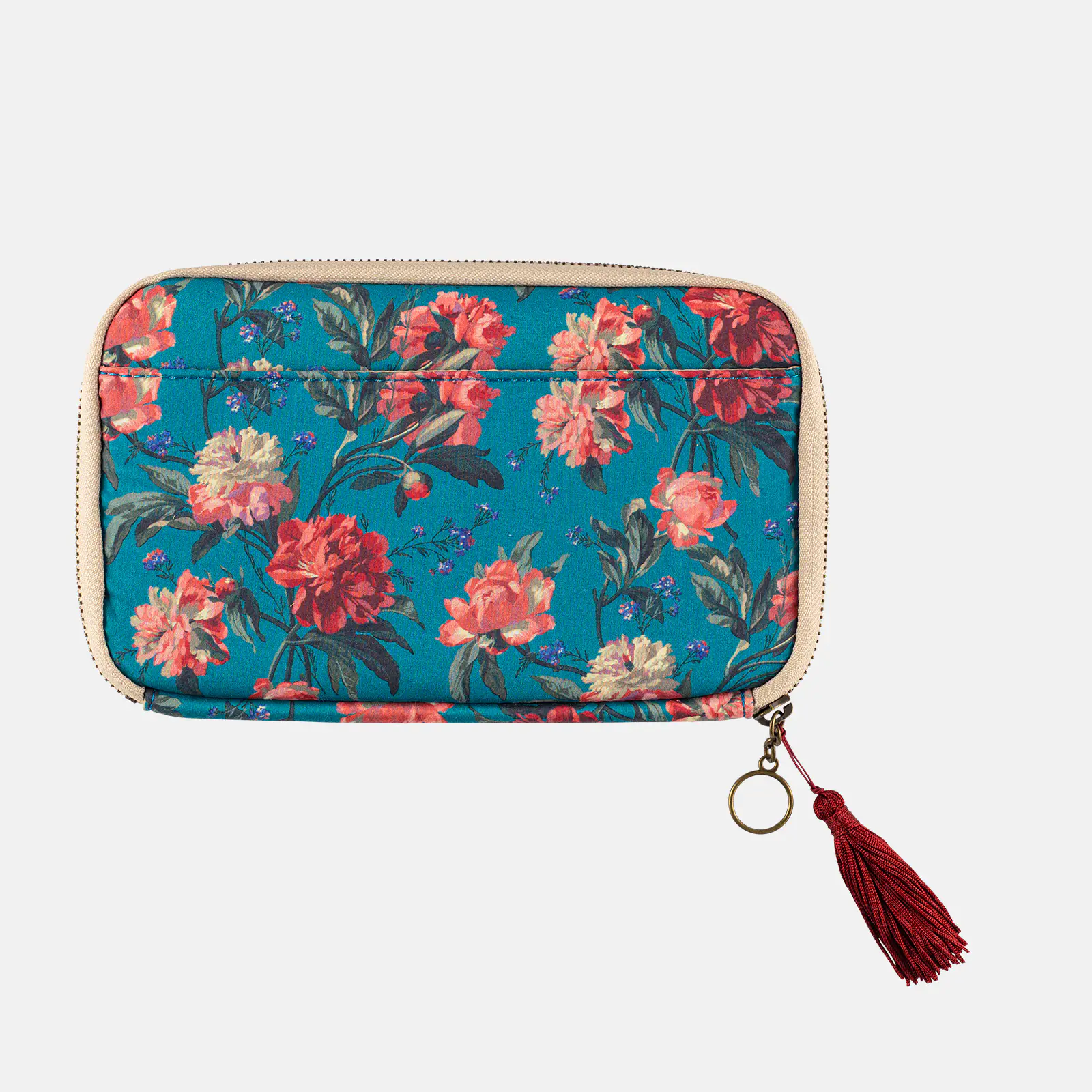 Decadent Blooms features a textile from Liberty Fabrics, which has fans all over the world. The dusky turquoise is printed with big peonies, roses, and forget-me-nots for a gorgeous, exotic look. The cover interior is beige, and the zipper pull includes a dark red tassel.