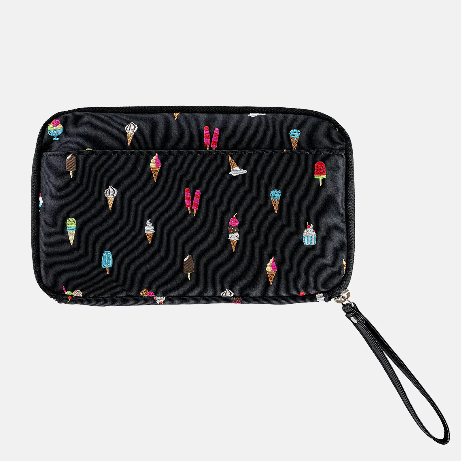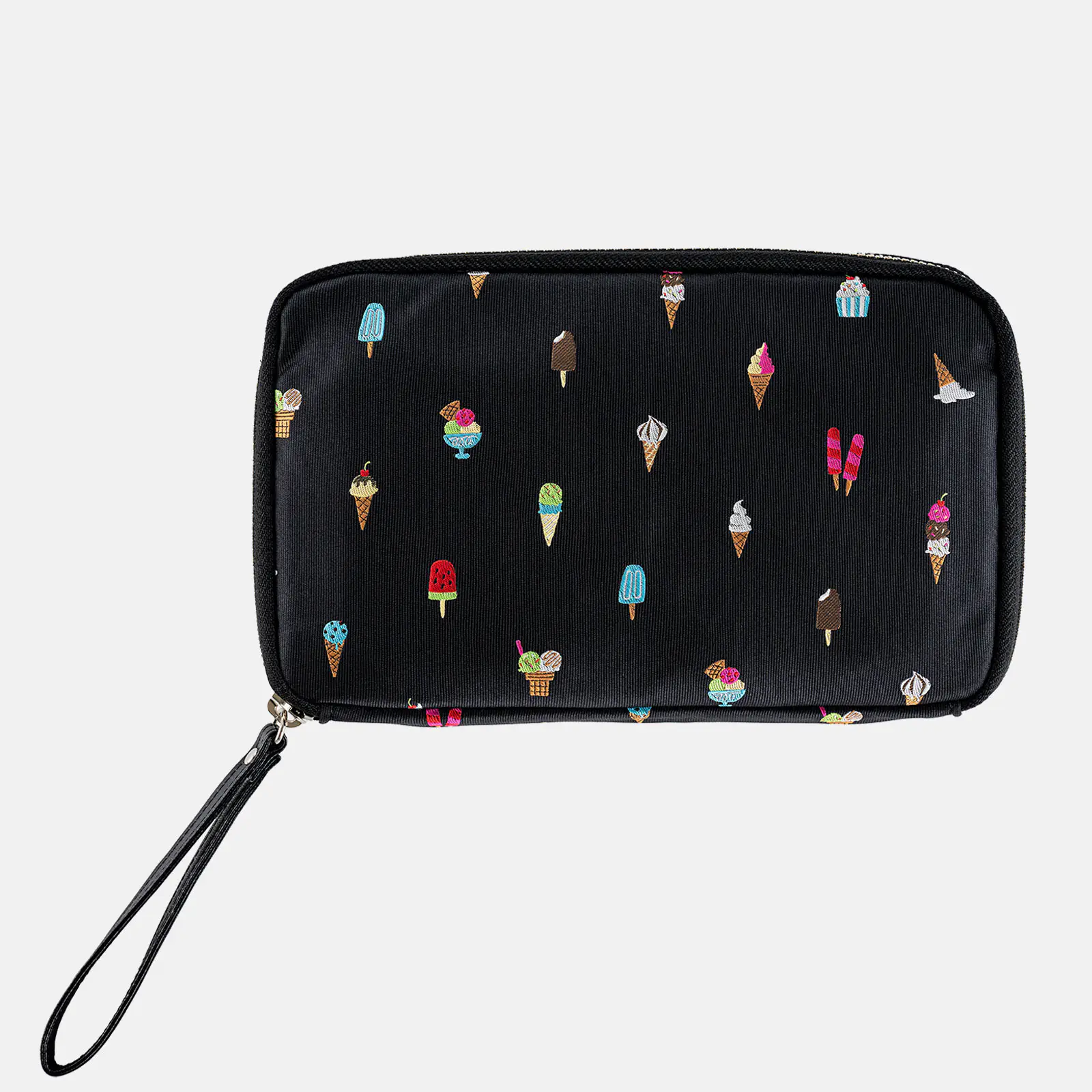 This Bow & Tie: Happy Ice Cream pouch is made with actual necktie fabric that has a pleasant textured feel and a beautiful sheen. The cheerful design features a black background filled with colorful ice creams. The interior is lined with a soft cream color, reminiscent of vanilla ice cream.