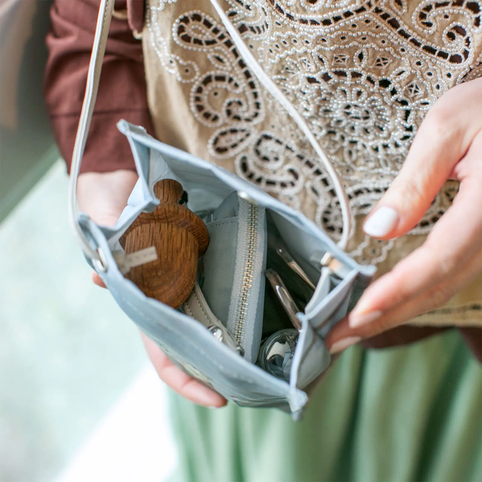 It has a thin strap to hang from your shoulder so you can keep your hands free while you carry around the items you need. You can adjust the length of the strap with an adjuster.