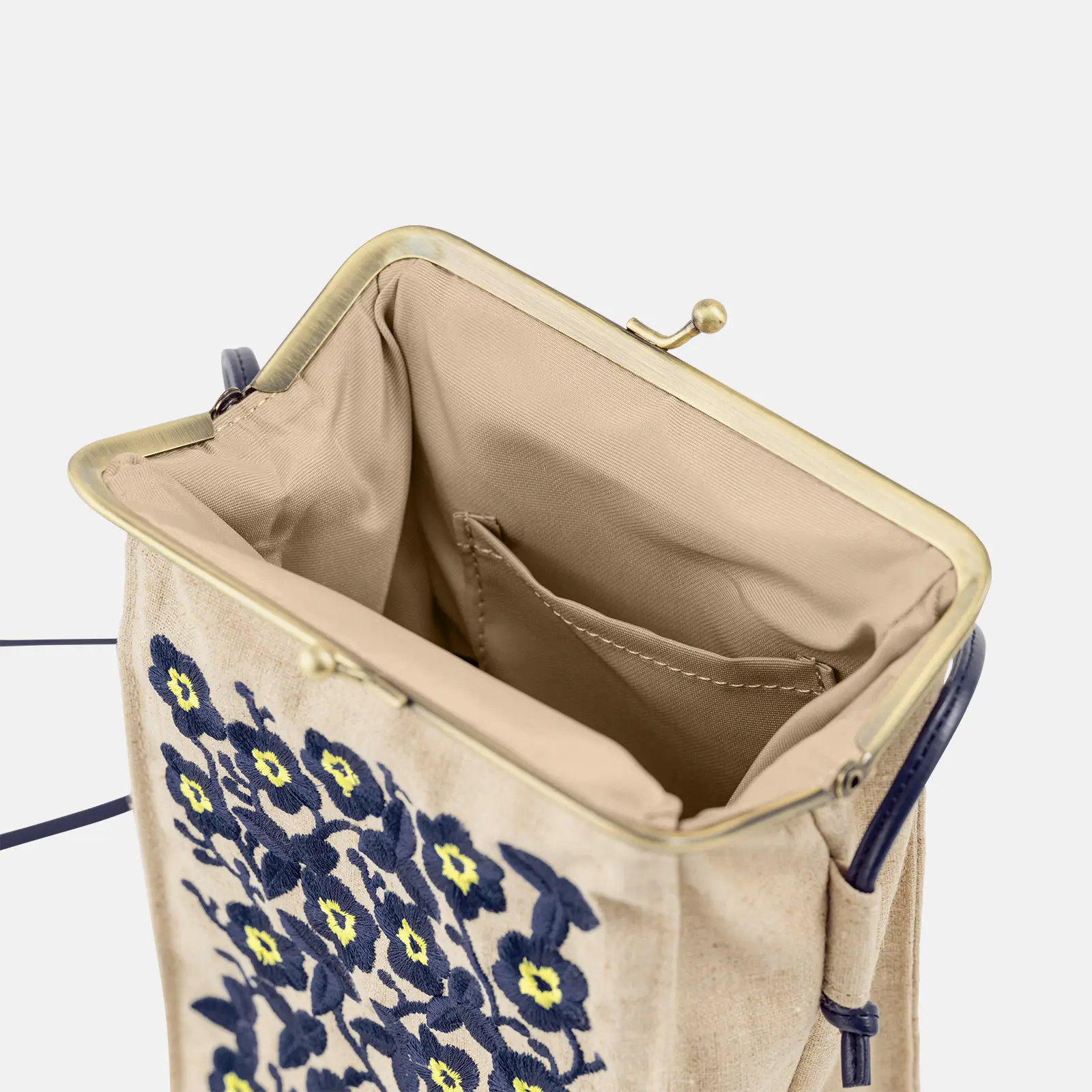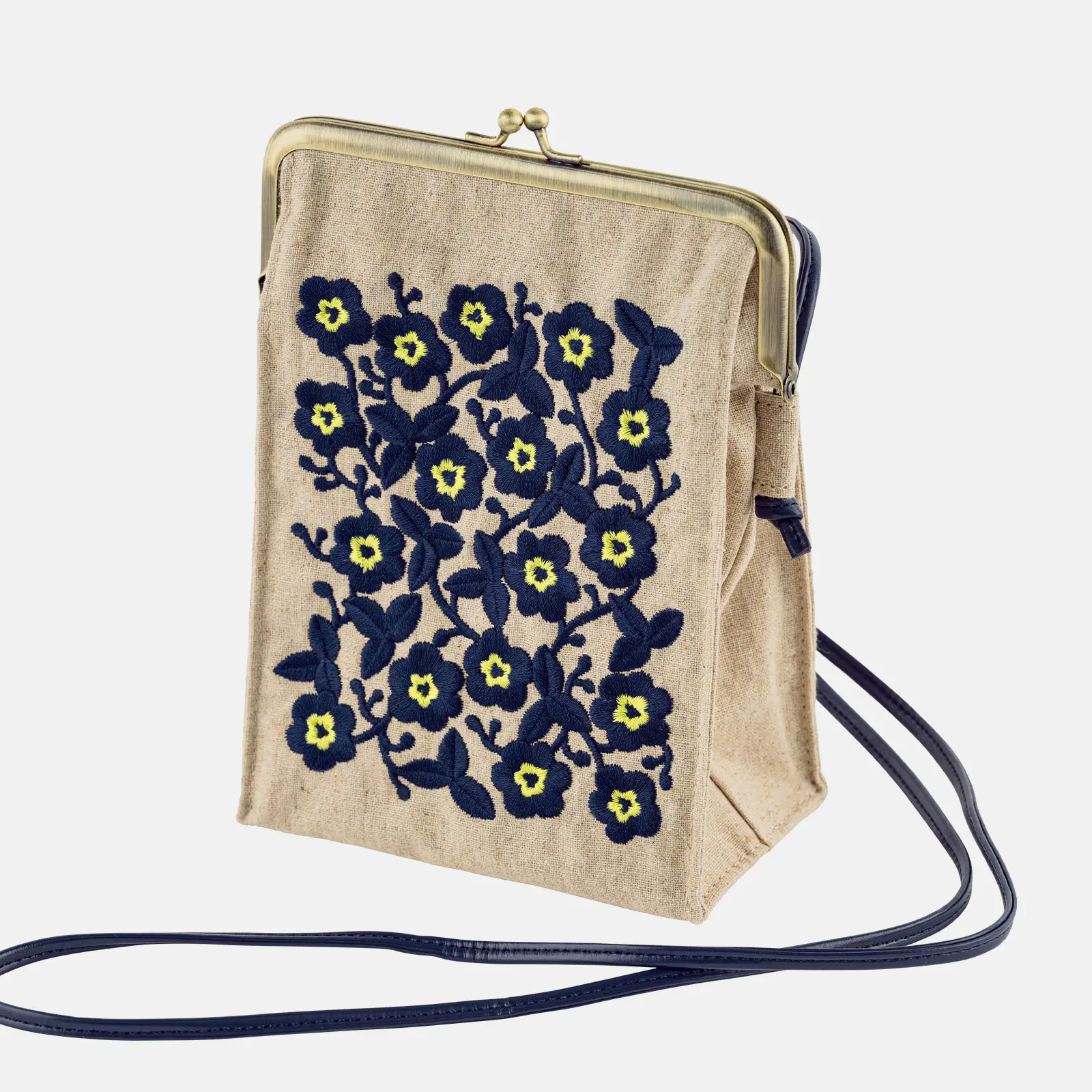 The Ukrainian Flowers design was previously featured on a very popular Hobonichi Techo Cover. The design is based on the beautiful embroidery of traditional Ukrainian clothing, sorochka. It has been recreated with navy and bright yellow threads embroidered onto a linen fabric. The interior is beige, and the kiss lock clasp is in antique gold. We also added a navy tassel.