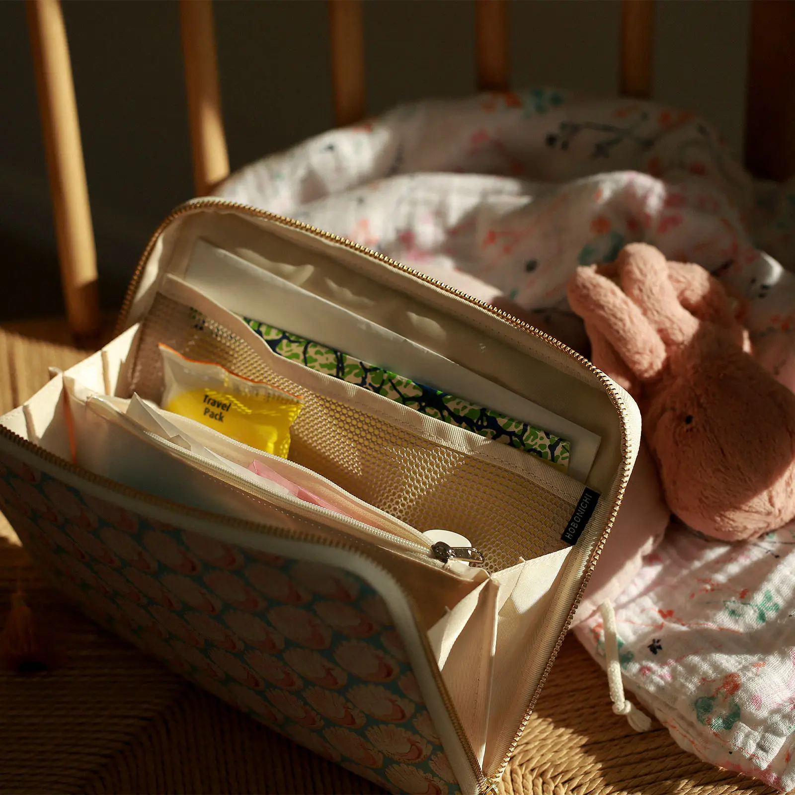 Parents can have peace of mind by consolidating important health information and child care items like a thermometer on hand. The pouch makes it easy to grab and carry around town. (Pictured: Peacocks of Grantham Hall)