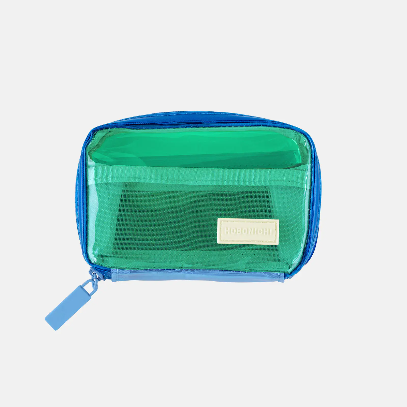 The vinyl is made up of light blue and mint blue panels, combined with darker blue on the gusset and back pocket for a refreshing, pop-inspired design. The inner pockets are made with a fine mesh material, allowing the contents to be just slightly visible—offering both fun and functionality. As a finishing touch, the pouch is accented with a silicone HOBONICHI label.