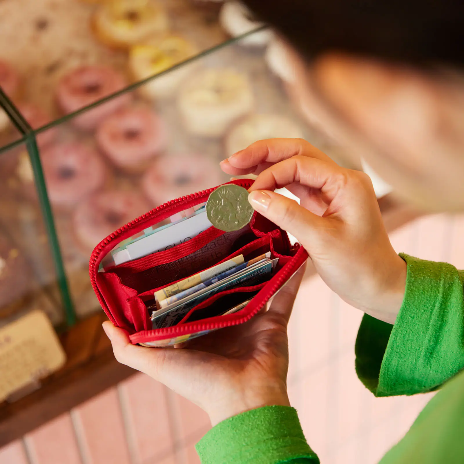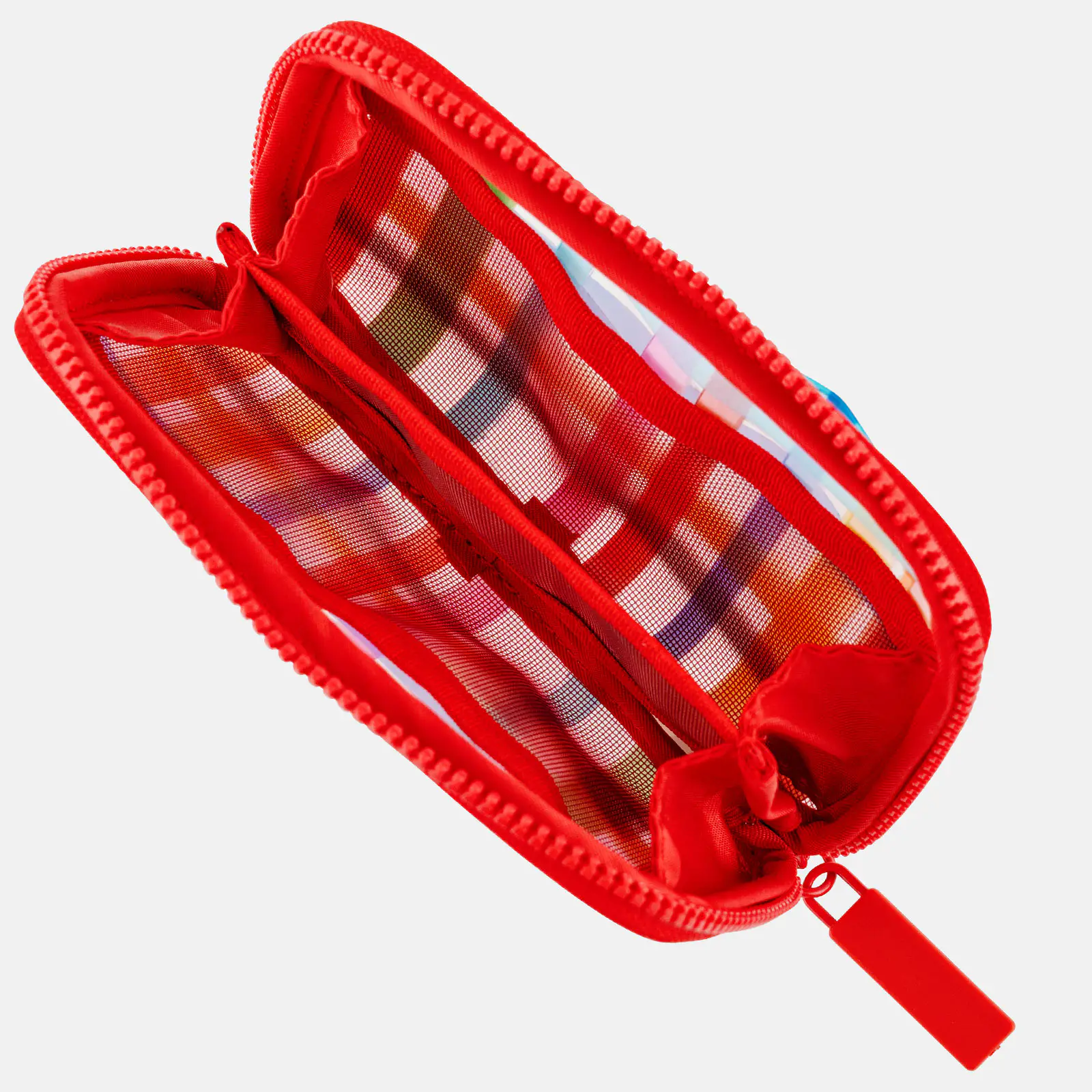The pouch opens accordian-style and is the perfect size for storing cards. The interior is split into four zones to allow for detailed organization. While compact, the pouch also has enough storage space to hold items with volume, such as lip balm and earbuds.
