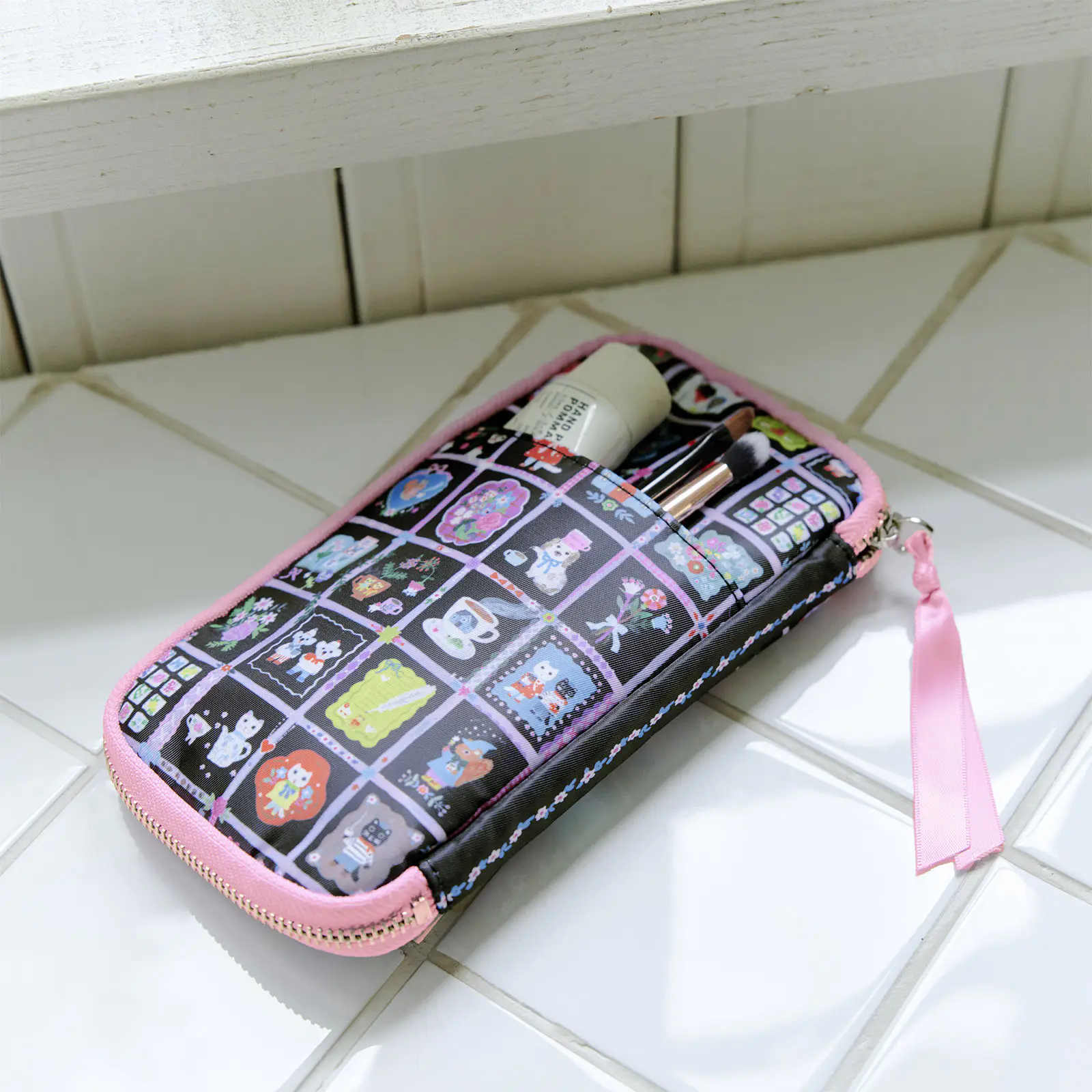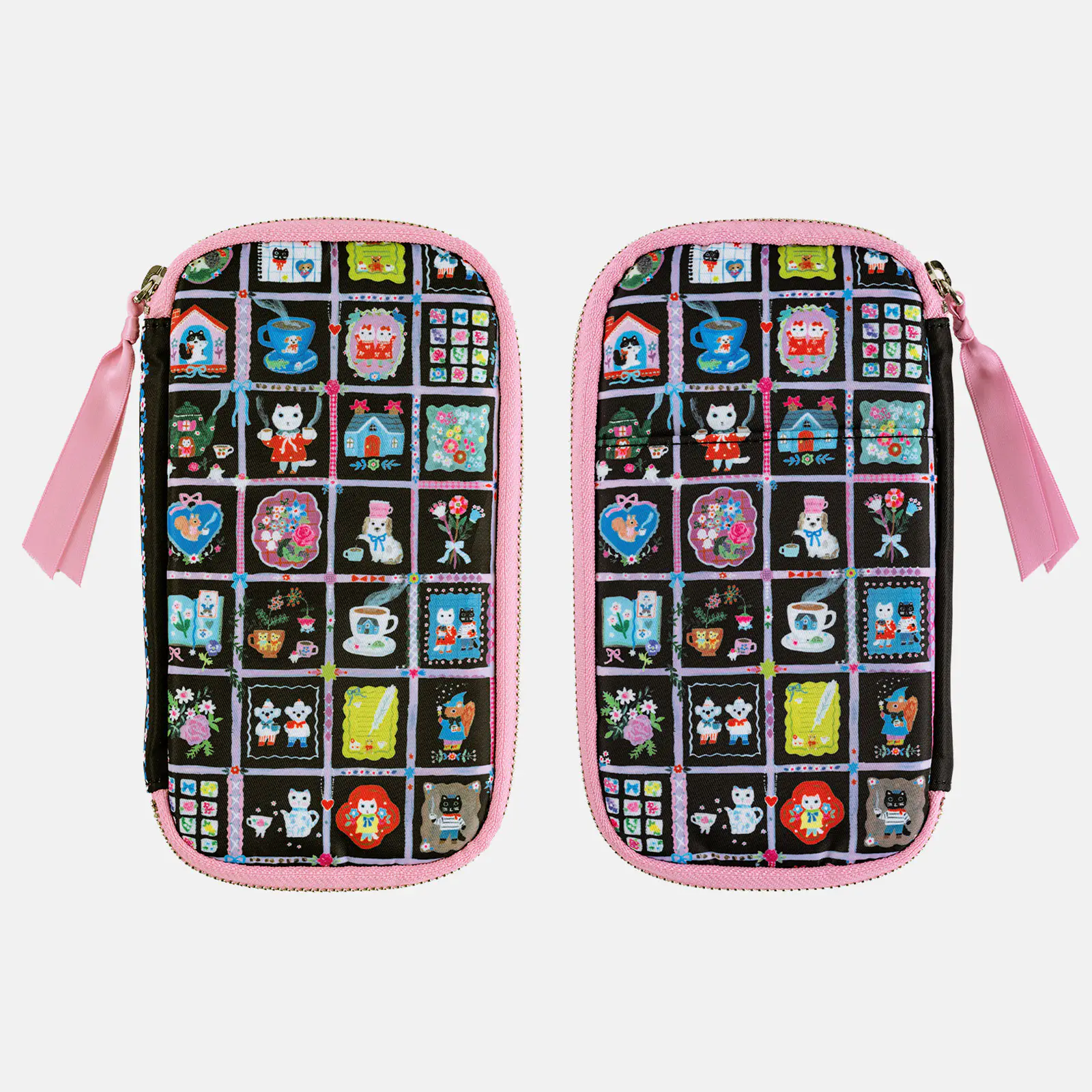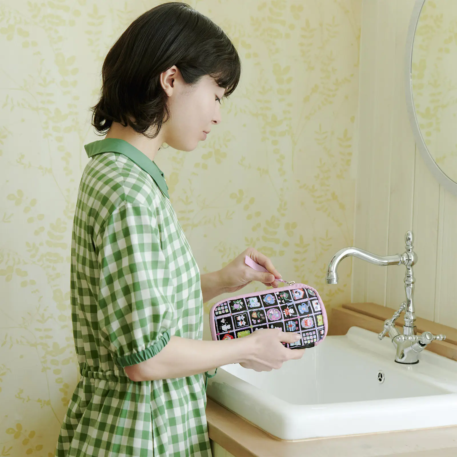 This pouch in the theme My Coffee brings illustrator Yumi Kitagishi’s drawings to life. It depicts a quiet and gentle time of relaxation, with a coffee in one hand as your companion. The black background is studded with colorful illustrations, and the pink binding and zipper pull of the case serve as accents. The interior is also in a pink shade.