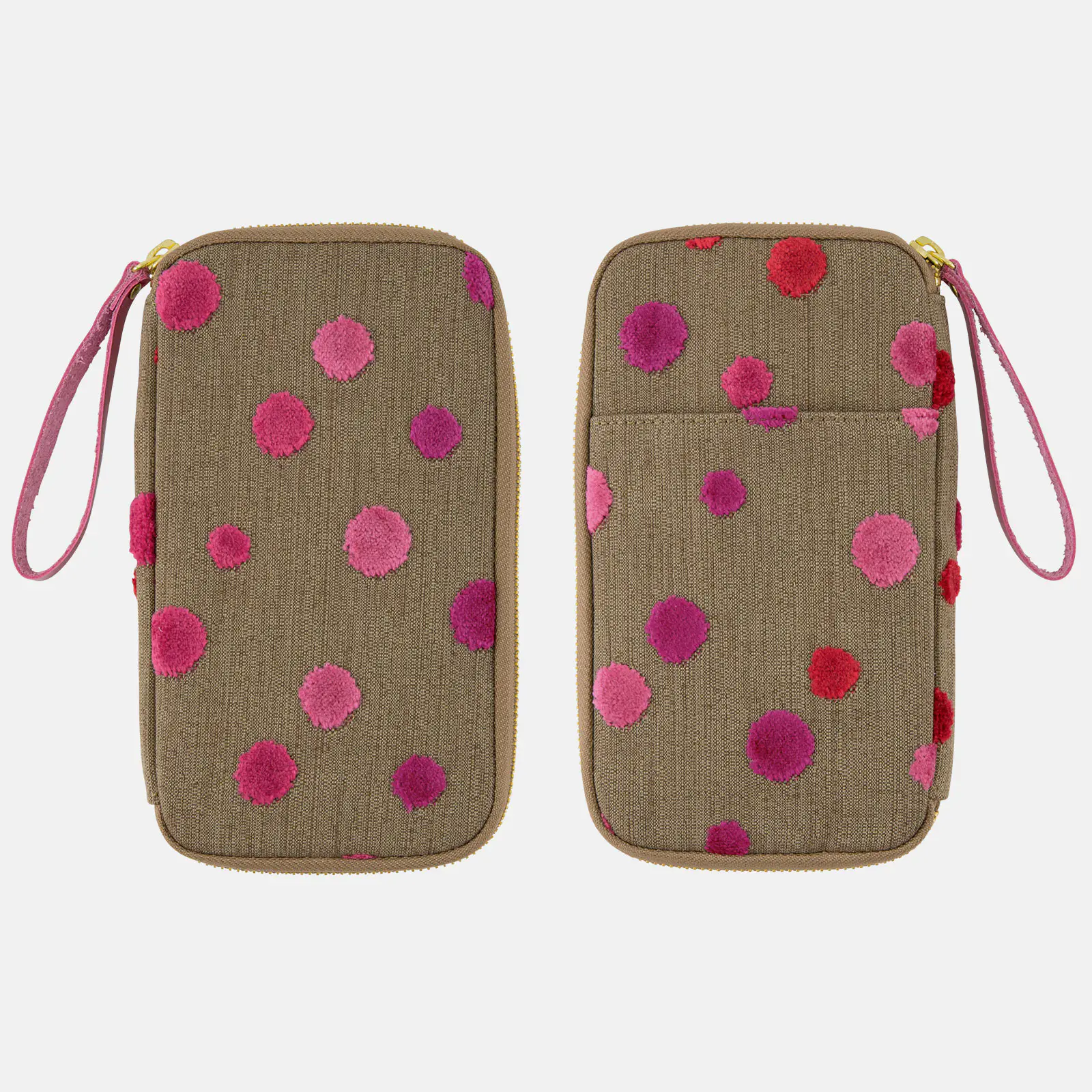 The polka dots have dynamic shapes to them, as if they were drawn freehand, and their texture is pleasing to the touch. There’s a warmth to the textile that doesn’t detract from the gorgeous look. The interior and hand strap are both hot pink.