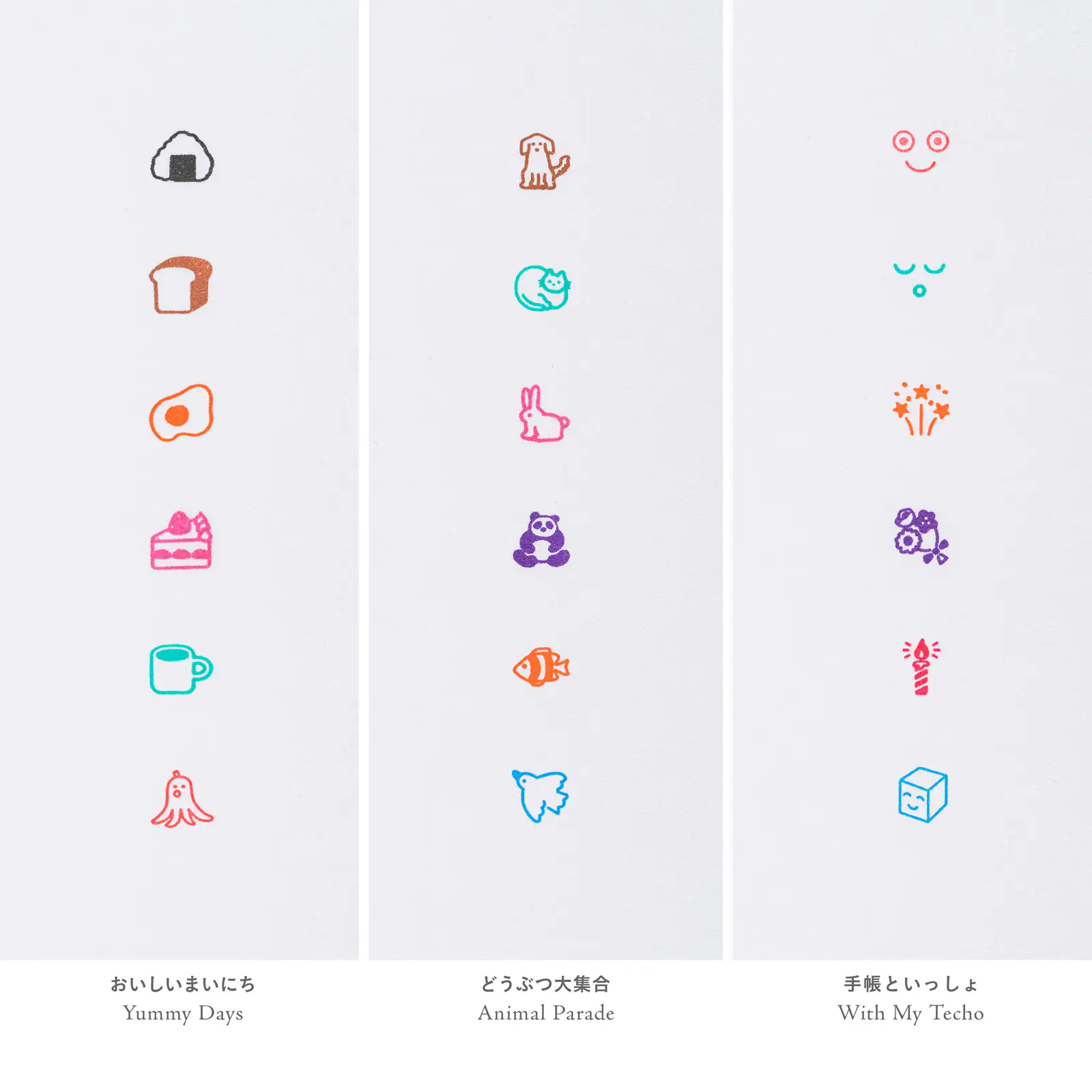 It comes in three types; “Animal Parade” with the design of dogs, cats, rabbits, pandas, and other adorable animals, “Yummy Days” with staple foods such as rice balls, bread, as well as cakes and octopus sausages, and “With My Techo” that makes the techo pages even more lively with face marks to use on active days and vacations and patterns to decorate anniversaries and to-do lists.