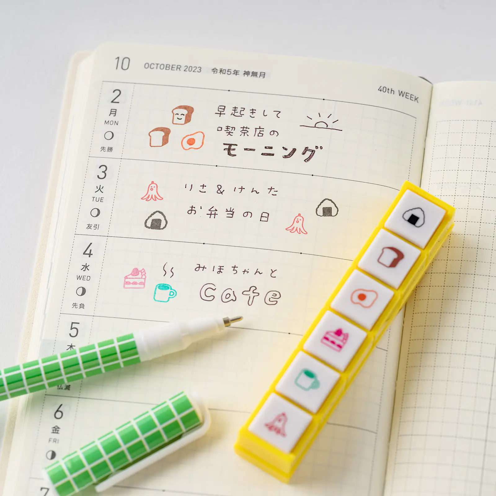 Each stamp size is 5.5mm and is quite small. It’s easy to use on the monthly calendar page to manage your schedules or add as an accent on your daily pages. Because each stamp uses a different color ink, it will add a fun touch of color to your techo. You can use them by layering colors since the ink does not smudge.