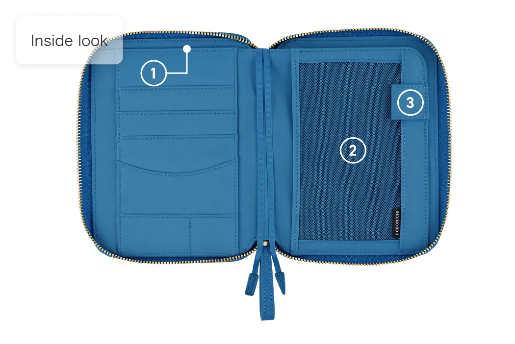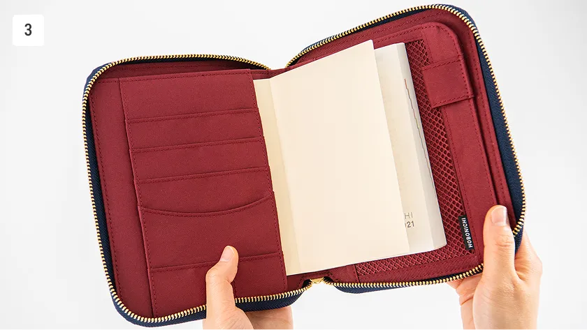 Ever since it first appeared in the 2003 edition lineup, this cover type has been loved by many and is the basic shape of the Hobonichi Techo cover. The main characteristics are the two pen holders that keep the cover shut and the various pockets.