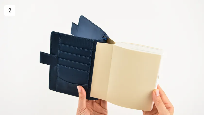 When buying the Hobonichi Techo as a book and cover set, you’ll assemble the set yourself. The cover fits the book quite snugly, but there’s a way to put it on without having to bend your book cover to squeeze it in. See the photographs below for instructions on easily inserting your book into its cover.