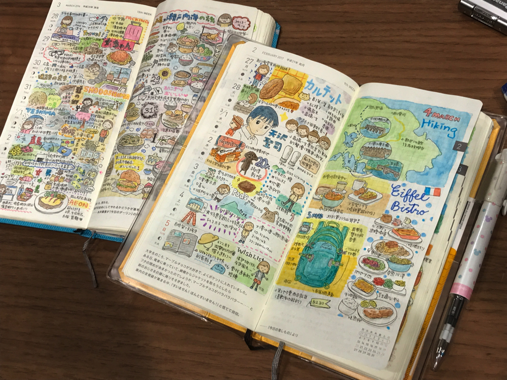 This drawing journal filled the pages of a Weeks, with the left page listing interesting things that happened that day, and the right page listing meals as the main theme. This user is learning Japanese, so the pages also contain entries about Japanese dramas and anime.