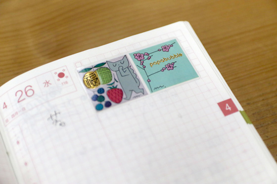 - This is a Fukuoka-exclusive sticker from the candy shop “Papabubble,” back when I designed packaging for them. I stick a lot of things in my pages, like sticky notes and washi tape. I really like how you can peel them off and reuse them. I have a huge stock of washi tape.