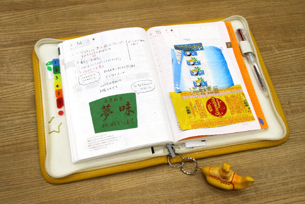 - I decided to go with the Weeks Mega this year, so that I could have three times as many blank memo pages in the back. With this cover, I can store my Weeks Mega, a pen, and business cards with room to spare. I even keep a “Curry no Ongaeshi” packet with me. (Laughs) I love how I can carry it everywhere I go without having to worry about handling it gently.