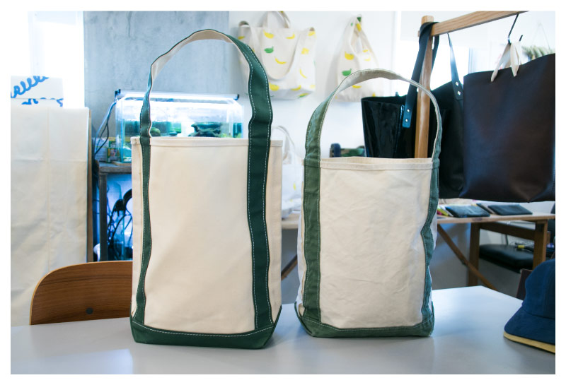 On the left is a new tote bag, and on the right is the one Nakaya has been using for five years. Once in a while he’ll use a scrub brush to wash the bag. Because the fabric shrinks after repeated washing, the color and size have changed, and the bag’s marks of use give it an appeal all its own.