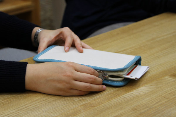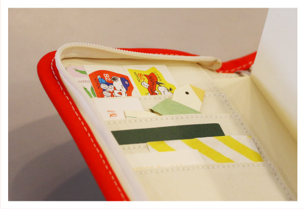 - I keep postcards in the big pocket on the inside, since I exchange postcards with someone when I travel. I keep stamps in here, too. Other than that, I store things like the fortune I picked at the temple on New Year’s. (Laughs)