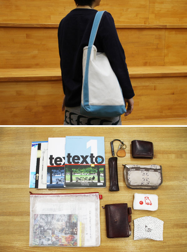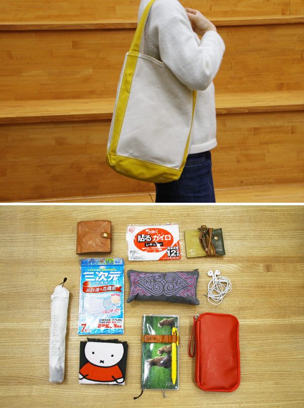 Morikawa carries a folding umbrella, pouch, and other items in her bag. “A tall bag makes it hard for other people to see inside, but I can see from where I am, and can pull out exactly what I need.